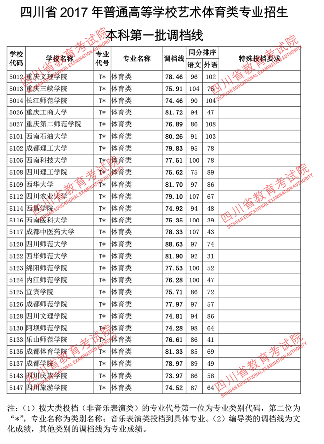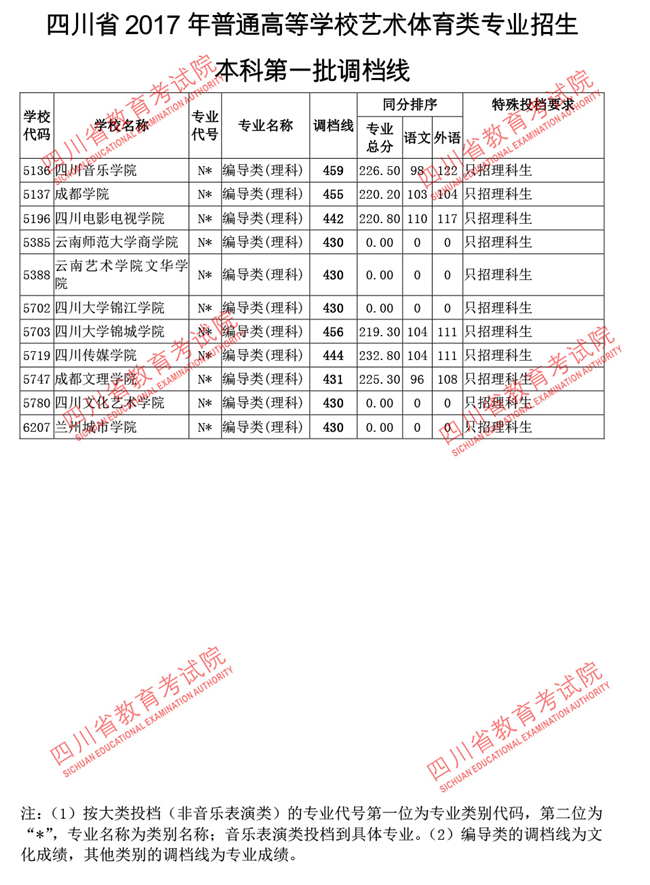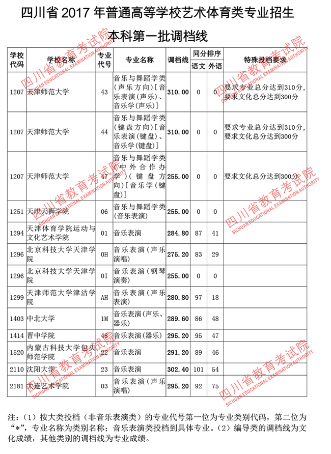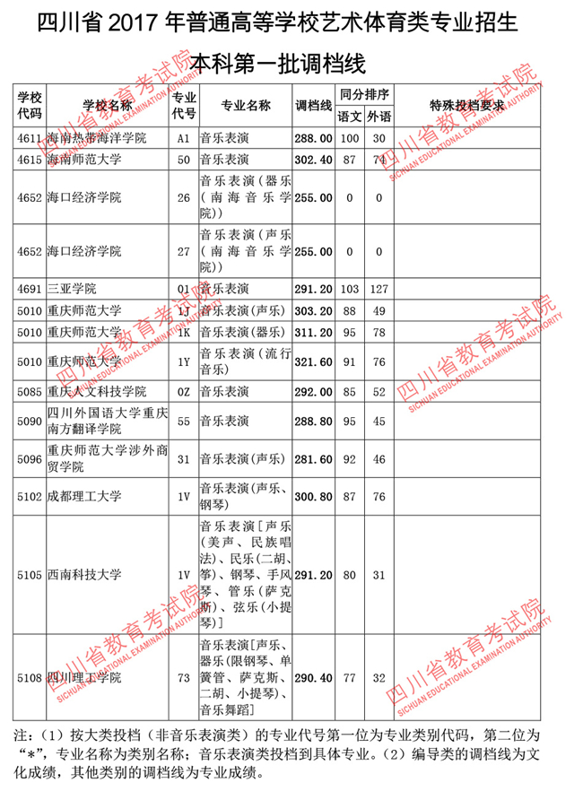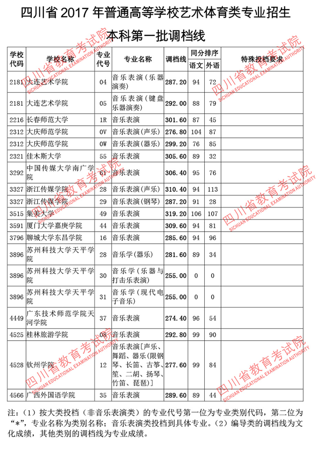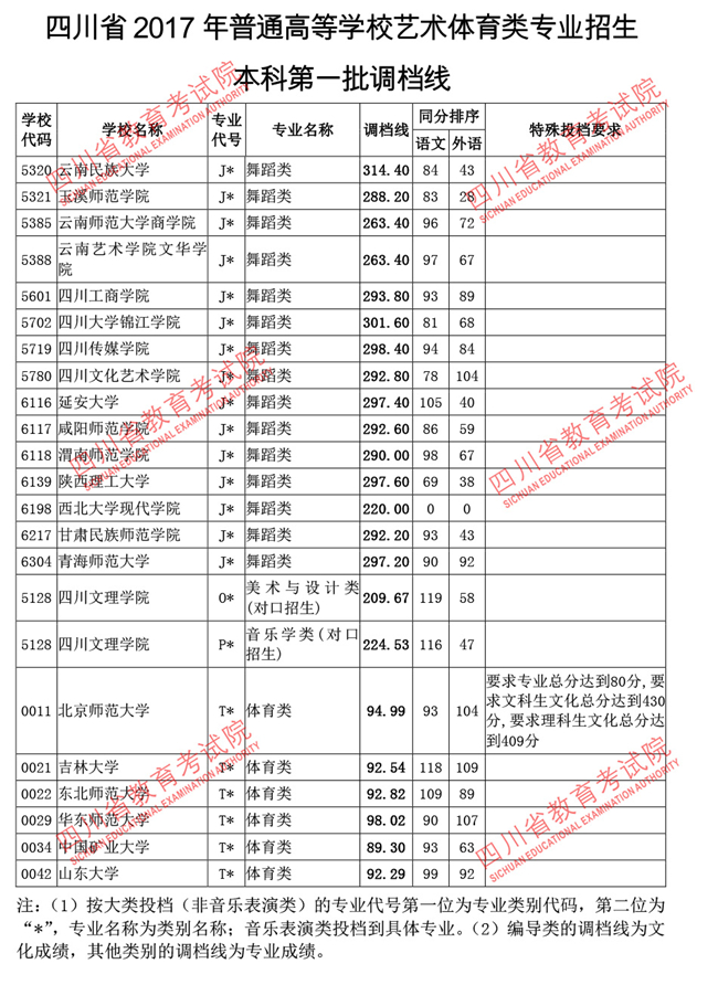 四川省2017年普通高等学校艺术体育类专业招生本科第一批调档线