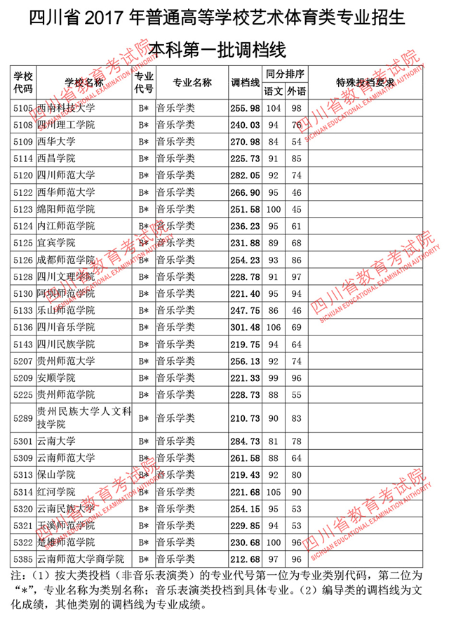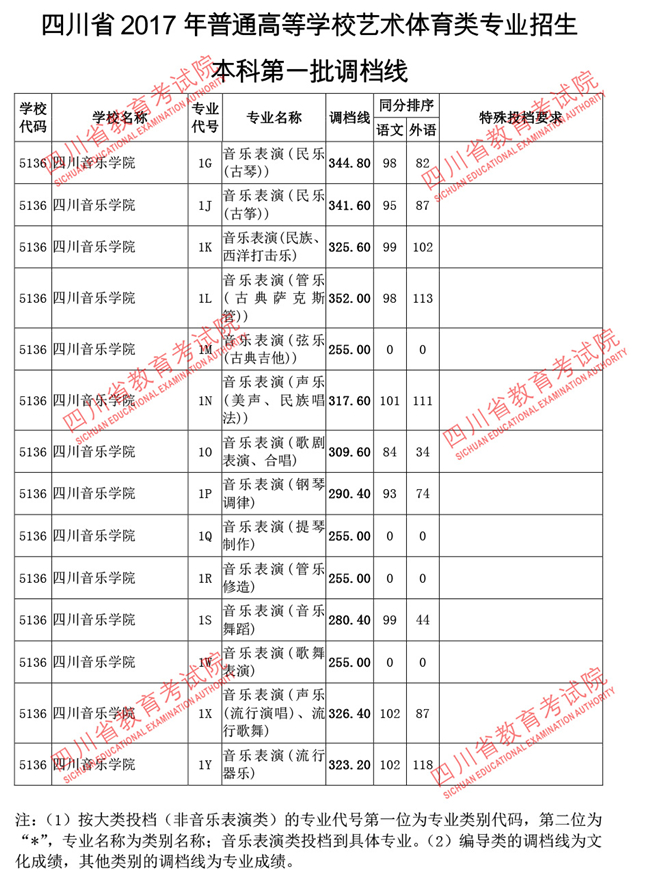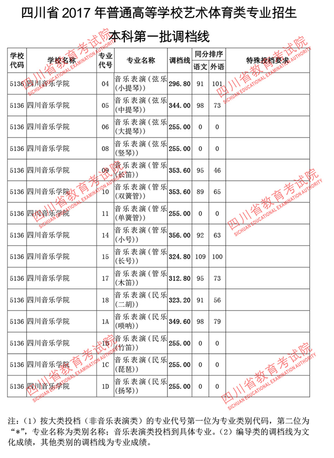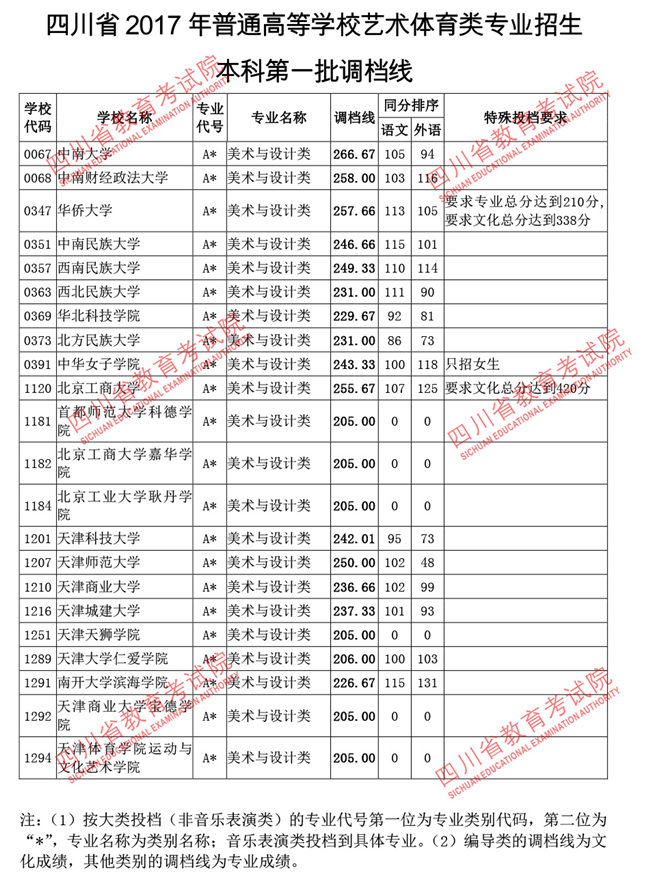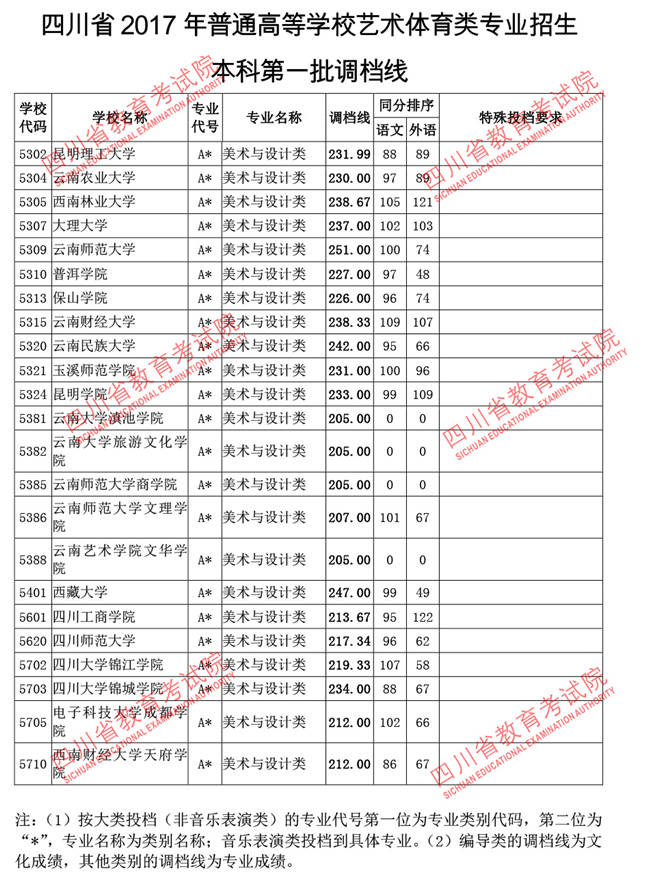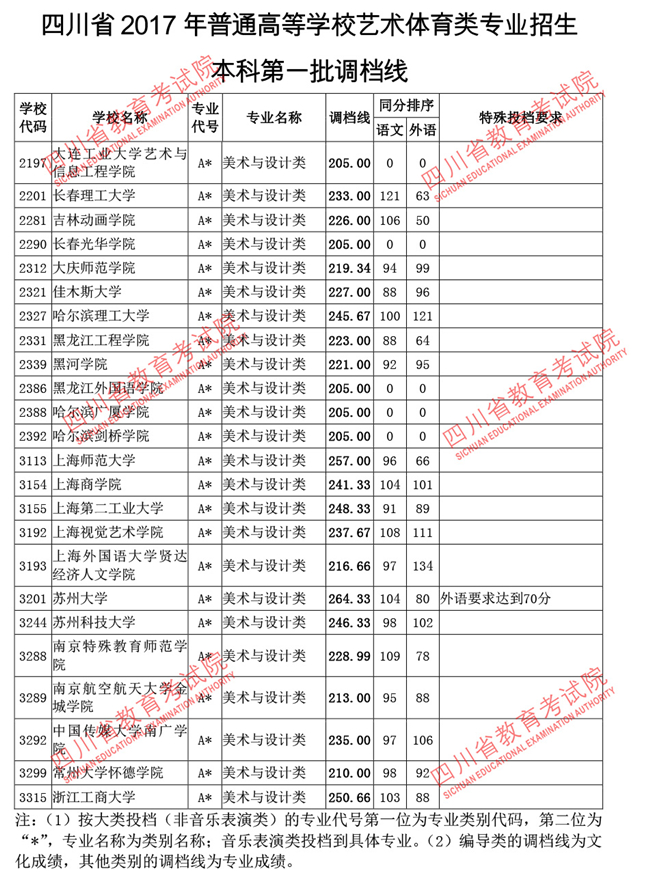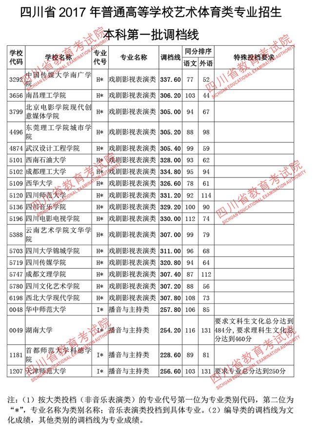 四川省2017年普通高等学校艺术体育类专业招生本科第一批调档线