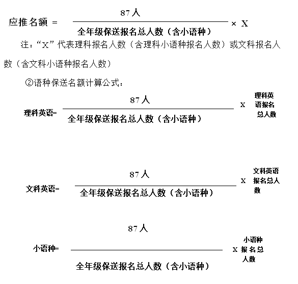 (1)推荐名额:若选择保送的学生总人数超过教育部规定的本校限额(教育部教学司〔2017〕9号文件规定本校2018年限额推荐外语类保送生87人),则依据本实施办法“推荐程序”所确定的、经公示无异议的学生总成绩,从高分到低分确定最终保送的87人名单。