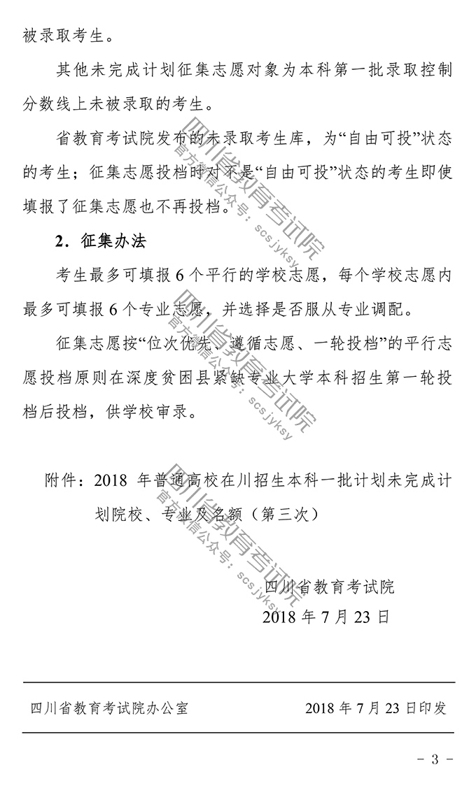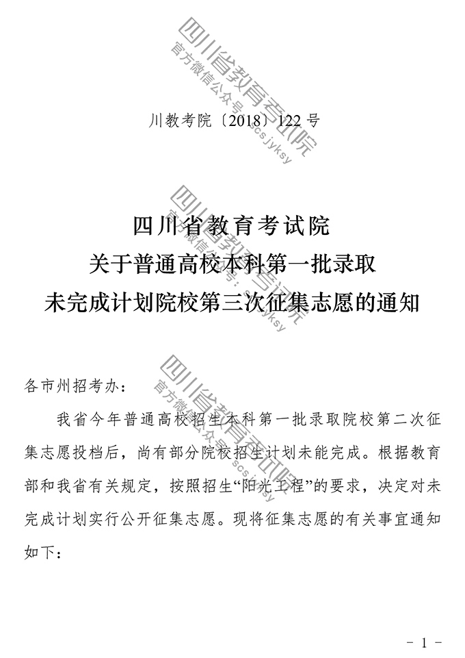 关于普通高校本科第一批录取未完成计划院校第三次征集志愿的通知