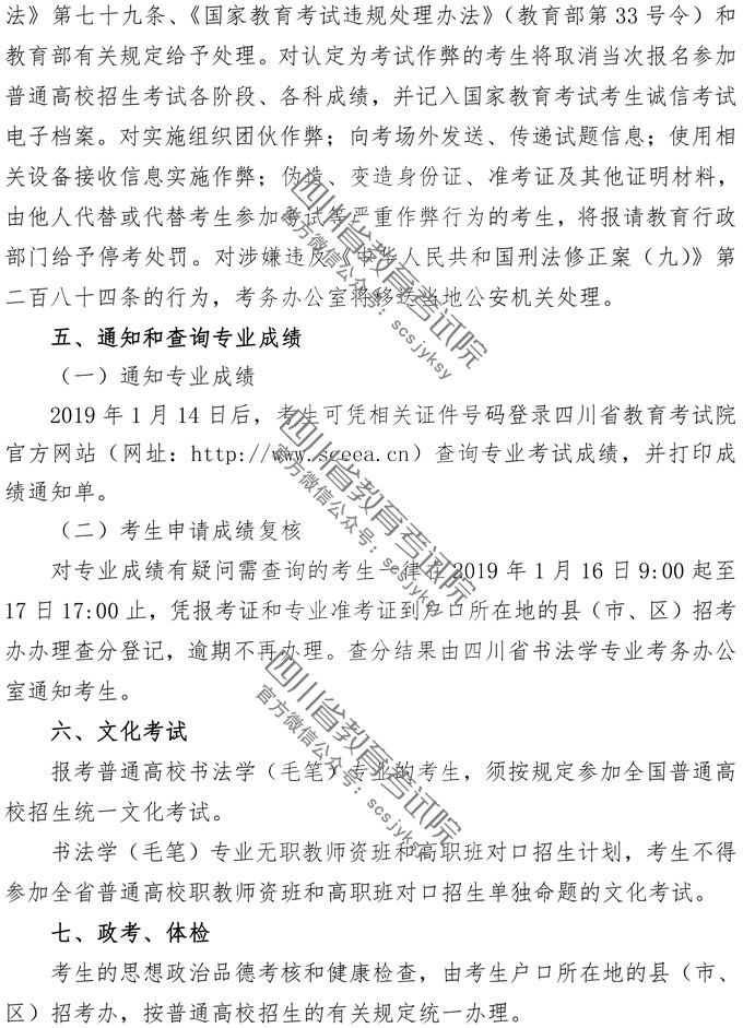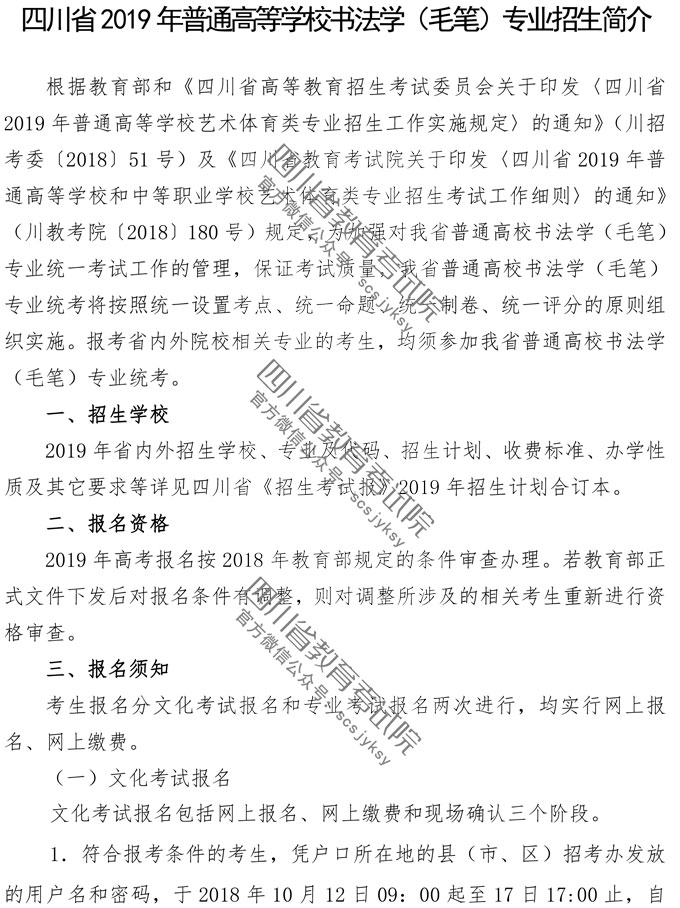 四川省2019年普通高等学校书法学(毛笔)专业招生简介