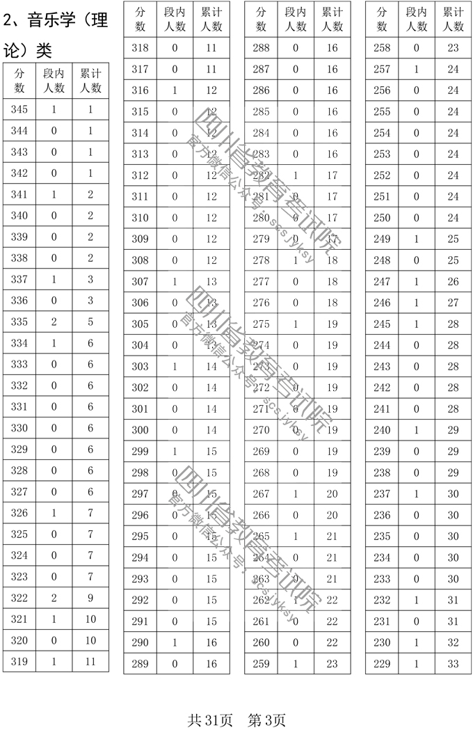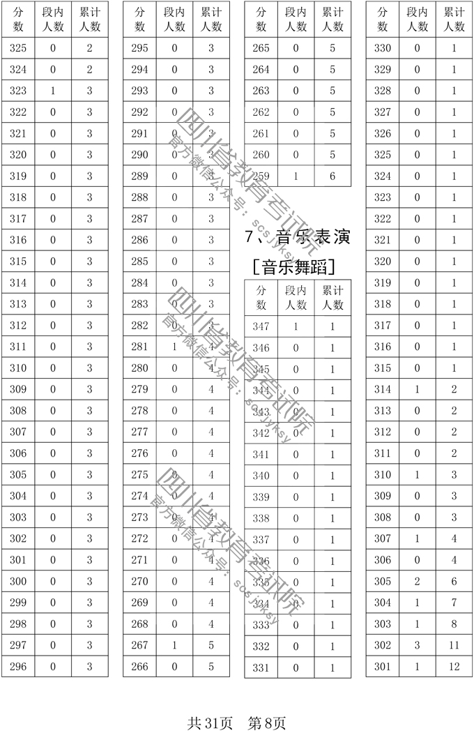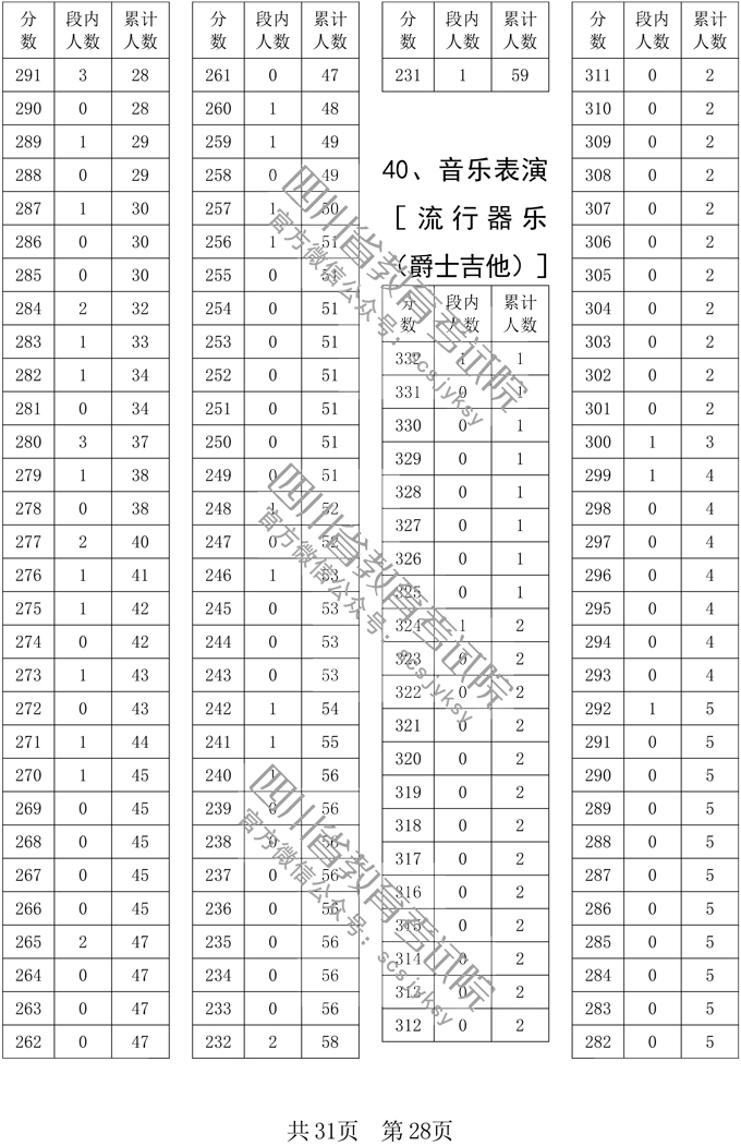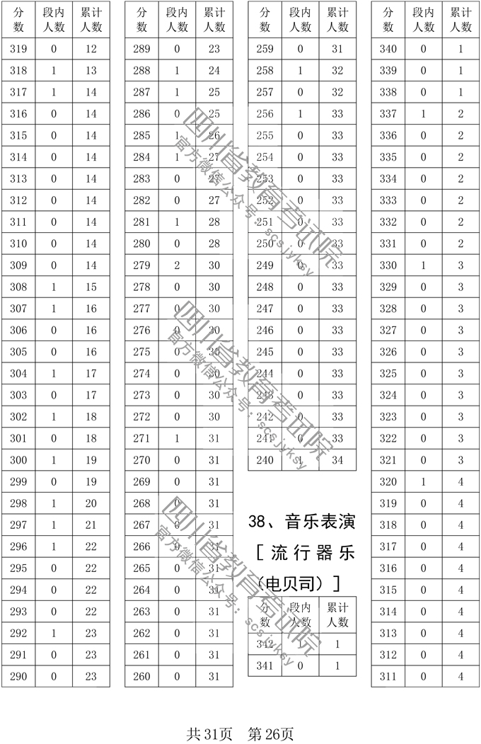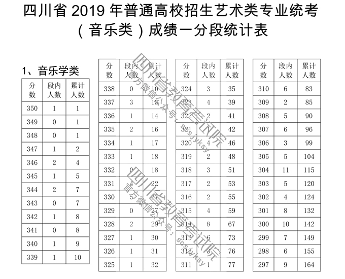 四川省2019年普通高校招生艺术类专业统考(音乐类)成绩一分段统计表