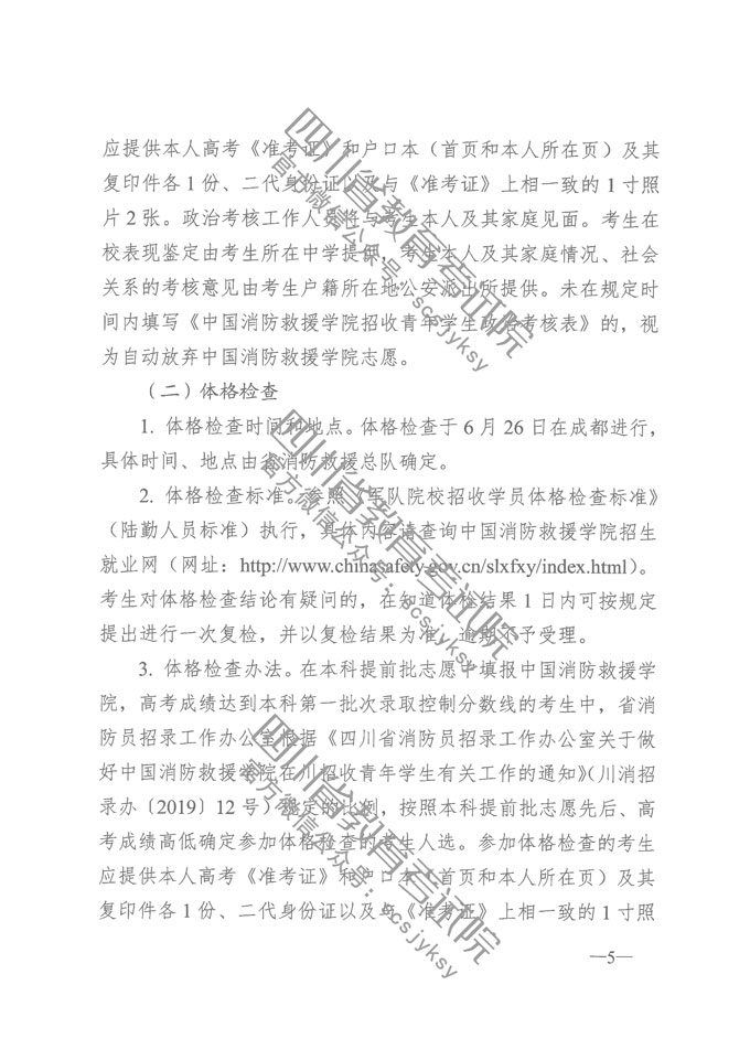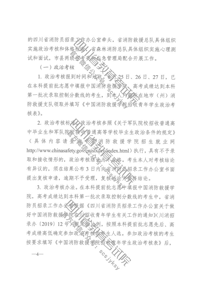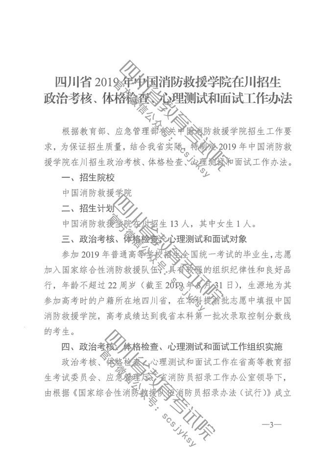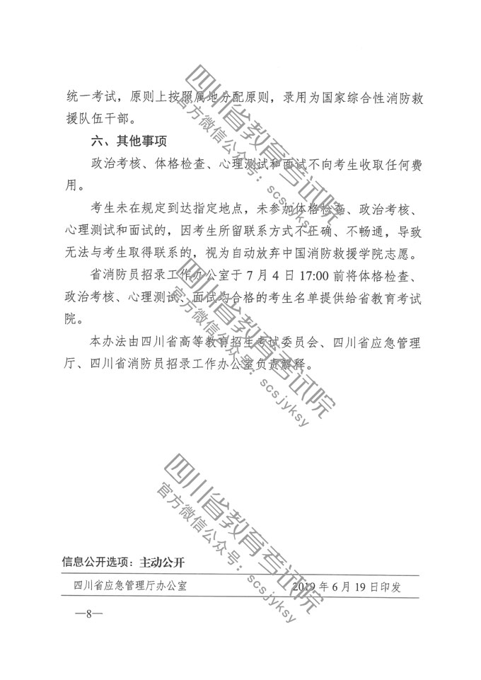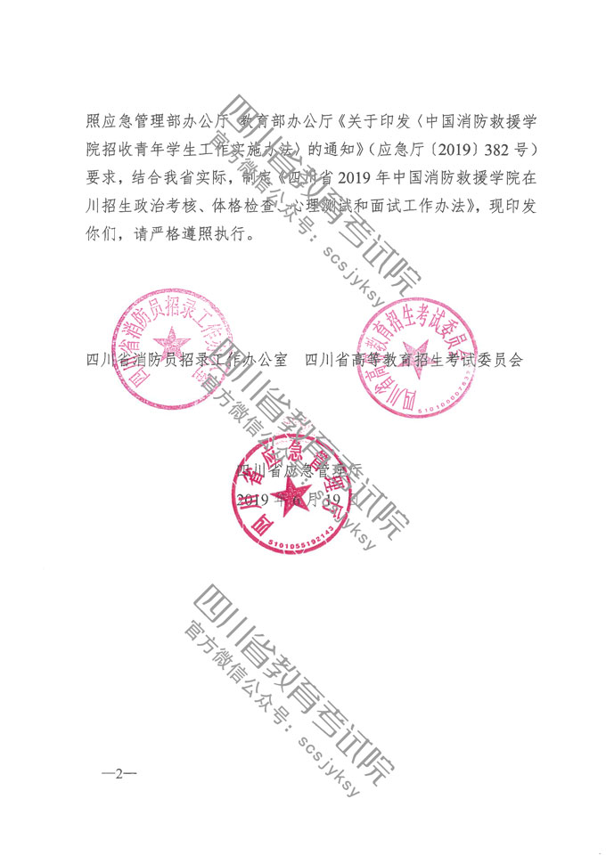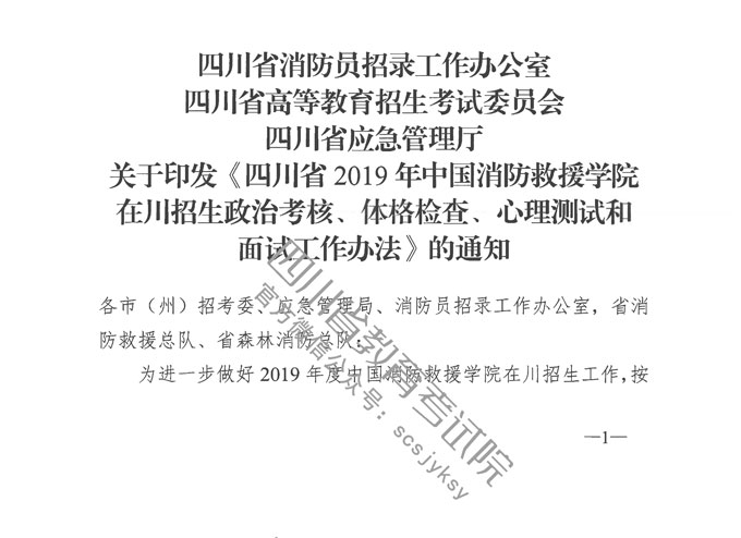 四川省消防员招录工作办公室、四川省高等教育招生考试委员会、四川省应急管理厅 关于印发《四川省2019年中国消防救援学院在川招生政治考核、体格检查、心理测试和面试工作办法》的通知