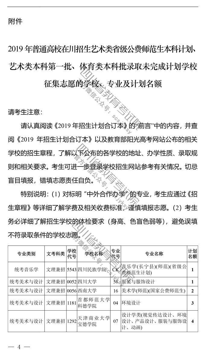 关于普通高校招生艺术类省级公费师范生本科计划、 艺术类本科第一批、体育类本科批录取未完成计划学校征集志愿的通知
