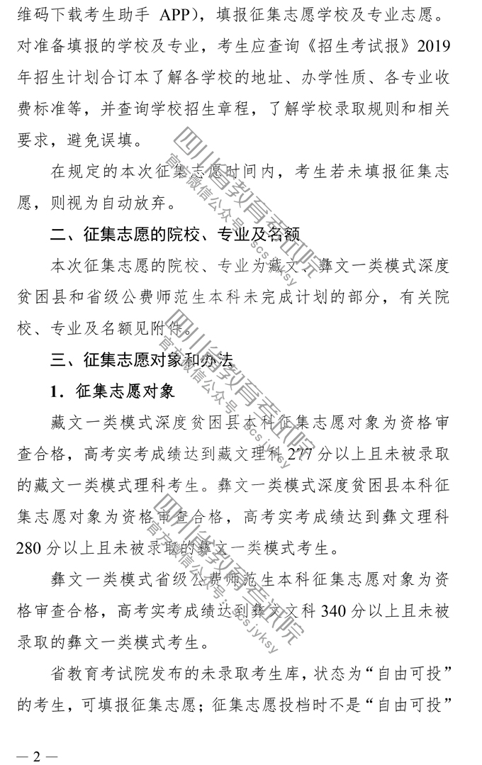 关于普通高校藏文、彝文一类模式深度贫困县和省级公费师范生本科录取未完成计划院校征集志愿的通知