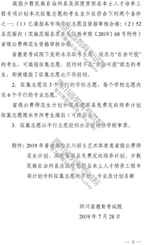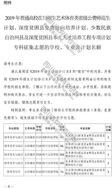艺体类公费师范生、深贫县免费定向培养、少数民族自治州县及深贫县本土人才培养专科未完成计划学校征集志愿
