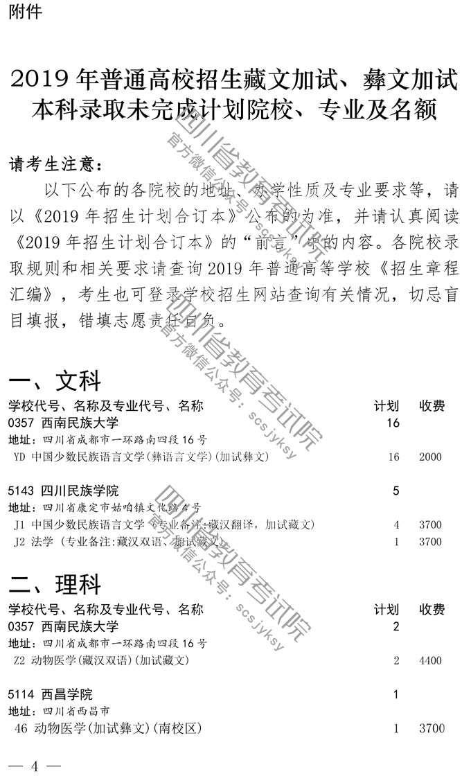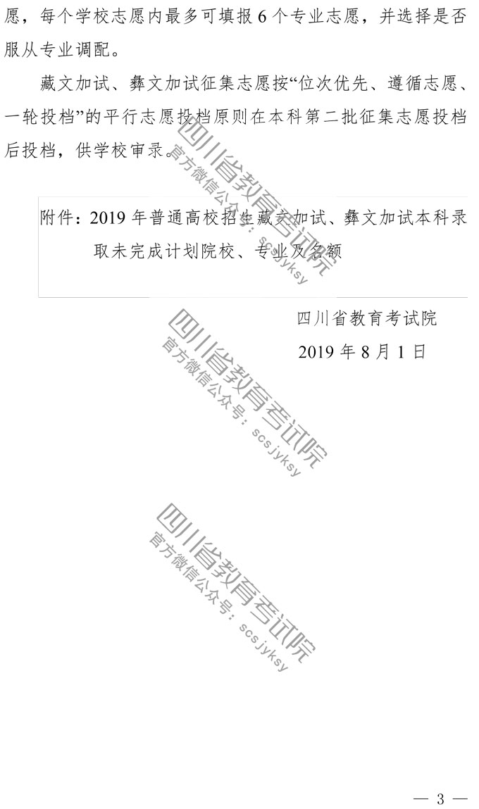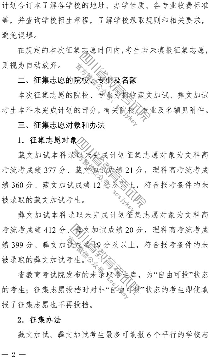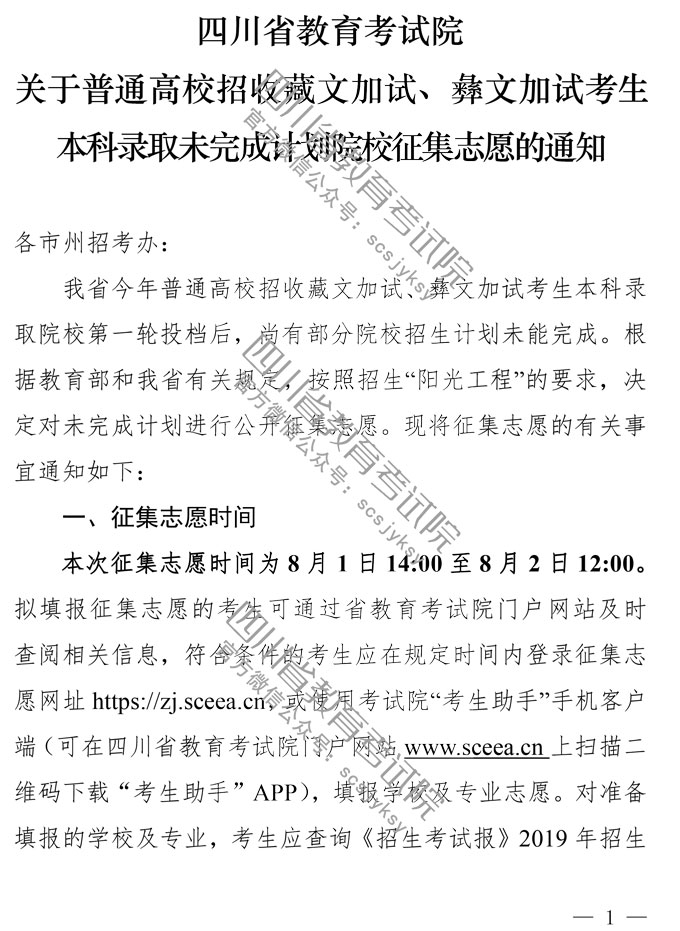 关于普通高校招收藏文加试、彝文加试考生本科录取未完成计划院校征集志愿的通知