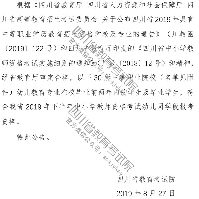 四川省2019年下半年中小学教师资格考试 (笔试)报名补充公告