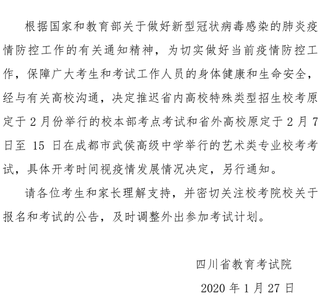 关于推迟四川省2020年部分普通高校特殊类型招生专业校考时间的公告