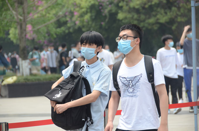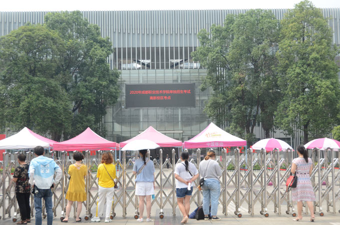 上午8点半左右,在成都职业技术学院(高新校区)、四川邮电职业技术学院、成都农业科技职业技术学院等考点,考生按照1米间距排队,扫描健康码,识别身份证,依序通过测温区,在考务人员的引导下,通过考试专用通道走进考场。