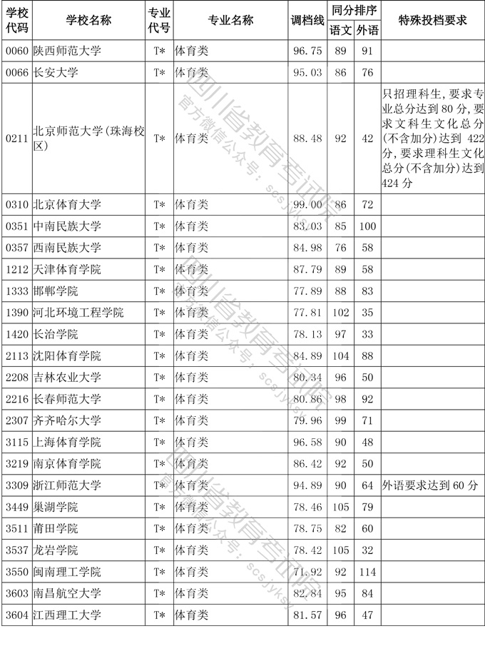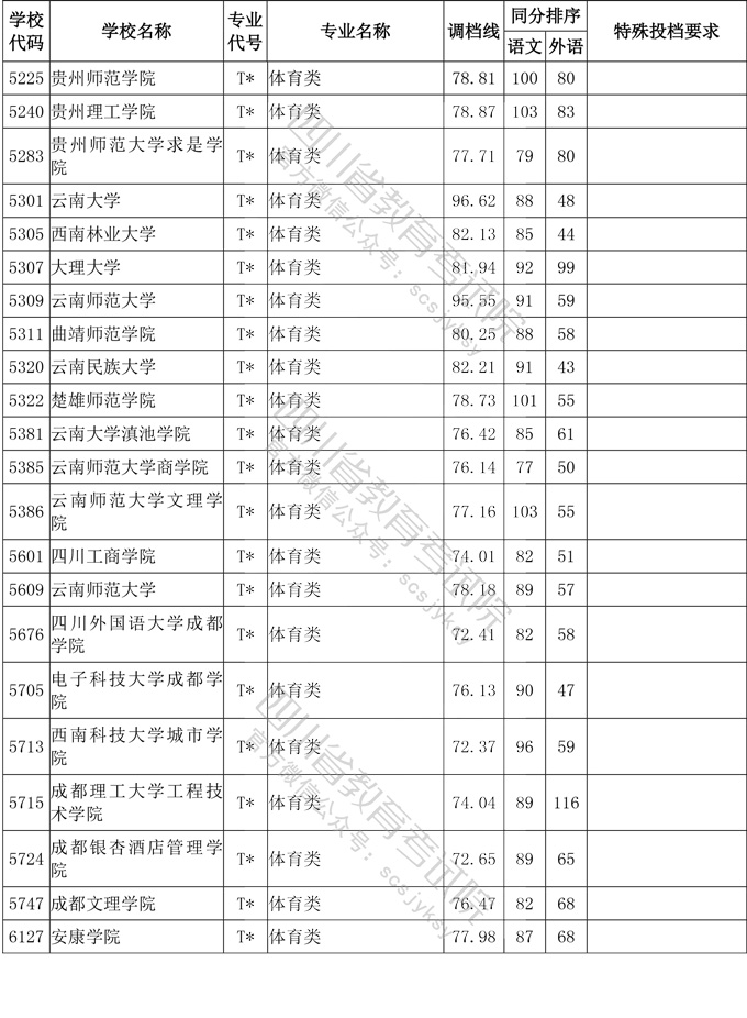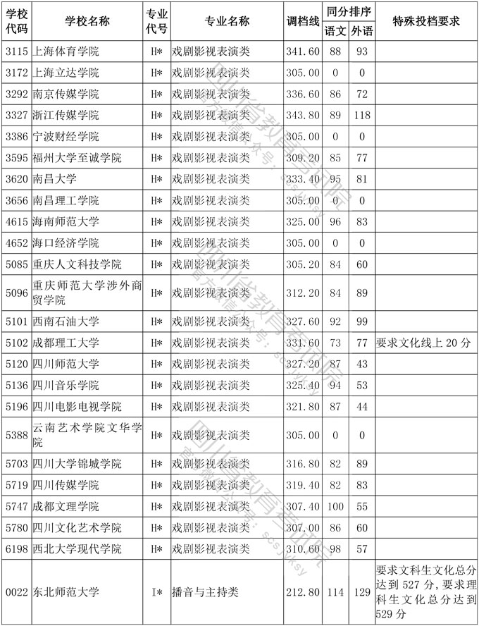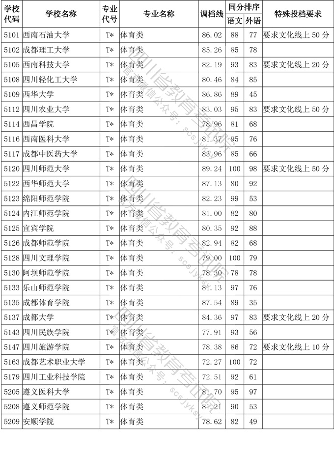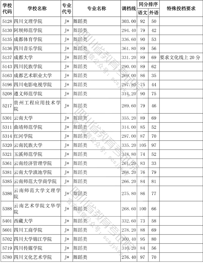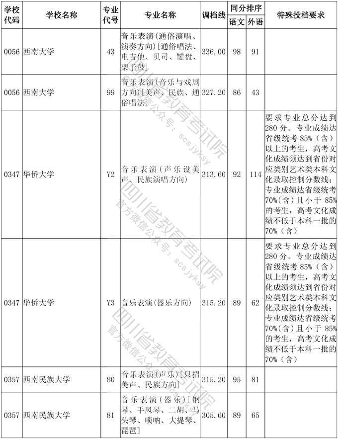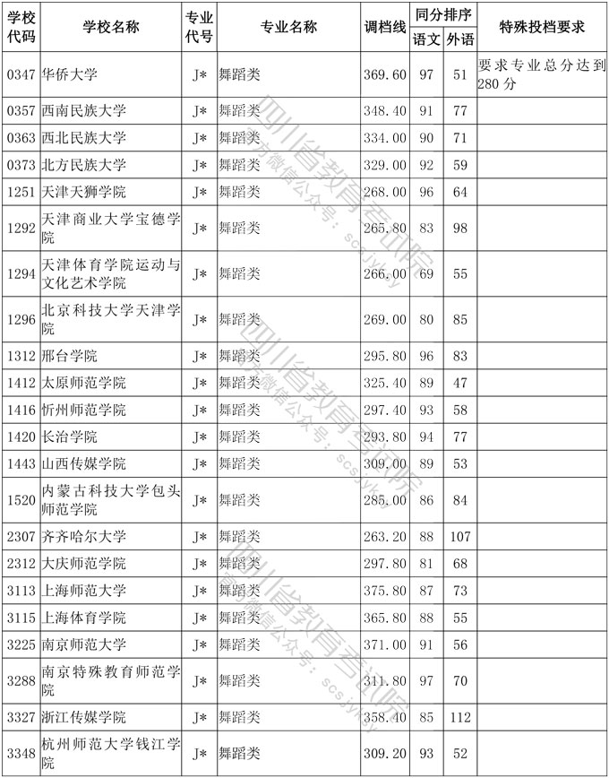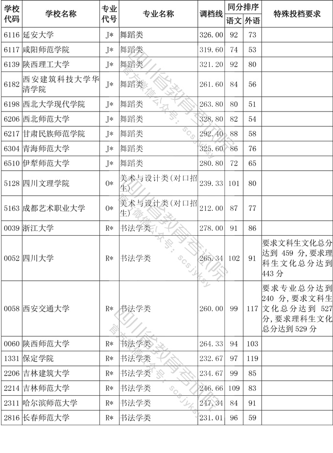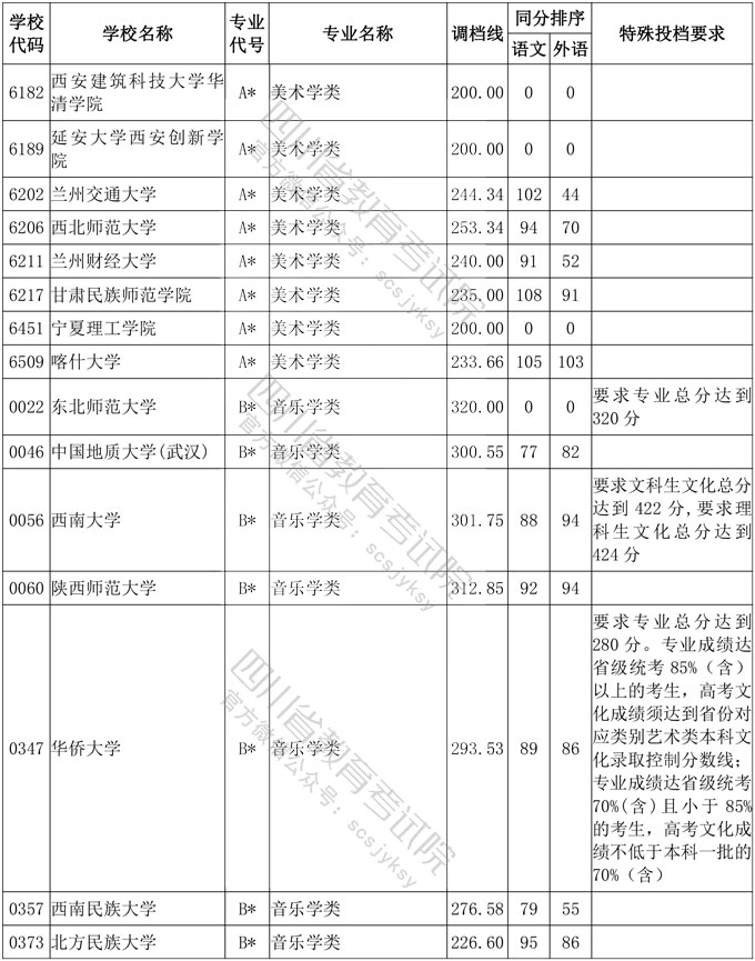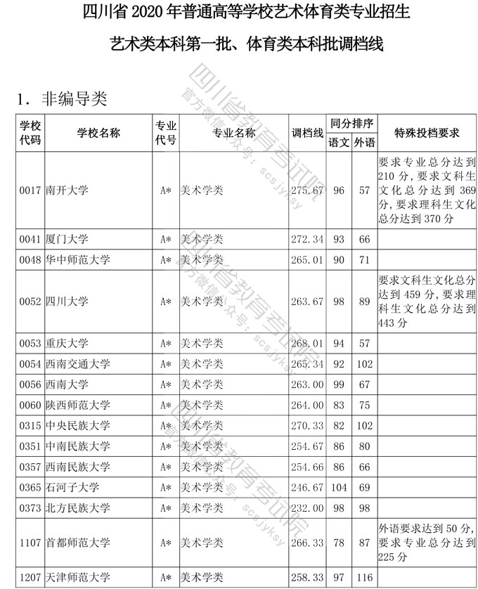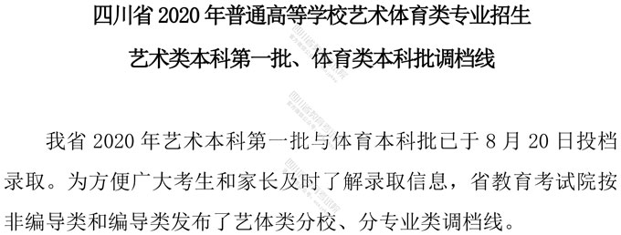 四川省2020年普通高等学校艺术体育类专业招生艺术类本科第一批、体育类本科批调档线
