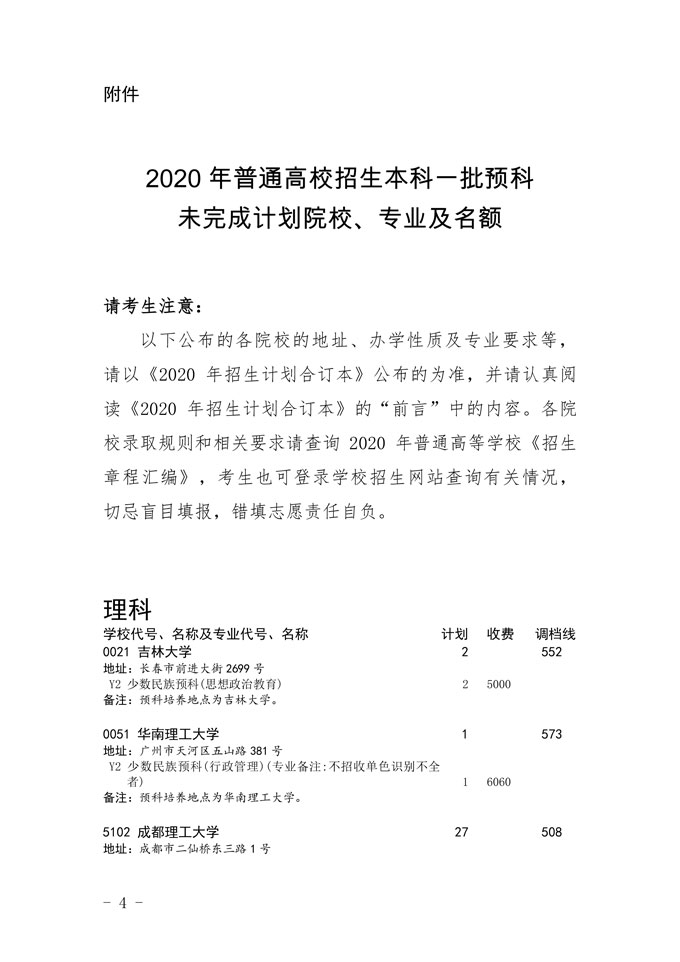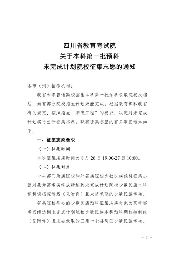 关于本科第一批预科未完成计划院校征集志愿的通知