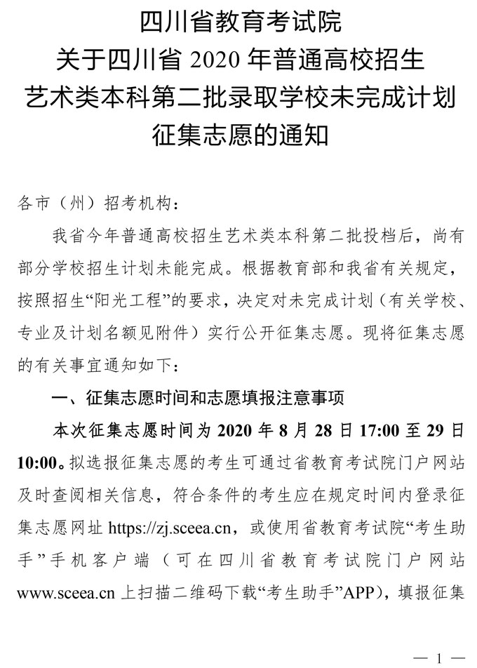 关于四川省2020年普通高校招生艺术类本科第二批录取学校未完成计划征集志愿的通知