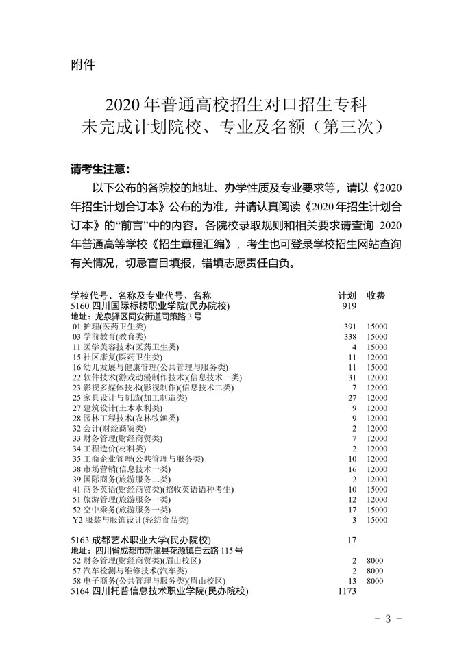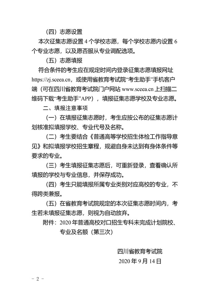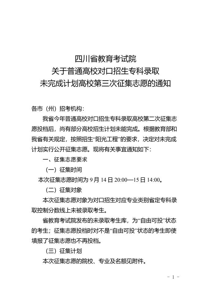 关于普通高校对口招生专科录取未完成计划高校第三次征集志愿的通知