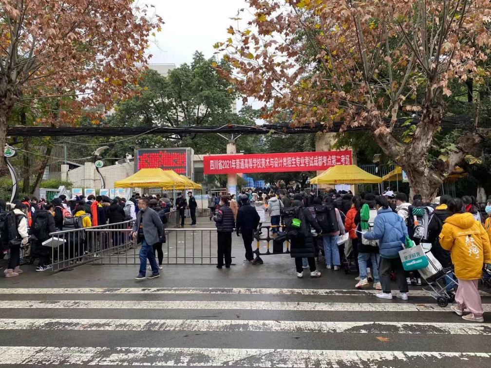 12月5日下午1点30分前,在四川师范大学考点外,考生有序排队进入考场。考生们背着画架,提着画具、颜料和小马扎,整装出发。
