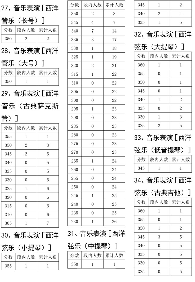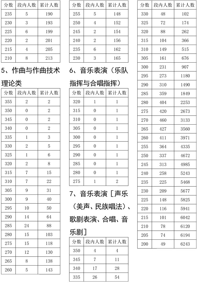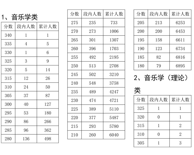 我省2021年度普通高校招生音乐类专业统考于2021年1月进行,考生参加校考资格线已经省招考委划定。为便于考生和组织专业校考的招生学校了解专业统考成绩分布情况,现把专业统考成绩达到校考资格线考生的专业总分五分段统计表进行公布,供考生和招生学校查阅。