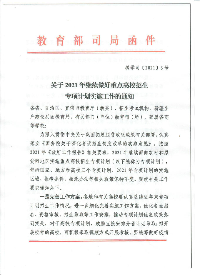 附件:1.教育部关于2021年继续做好重点高校招生专项计划实施工作的通知