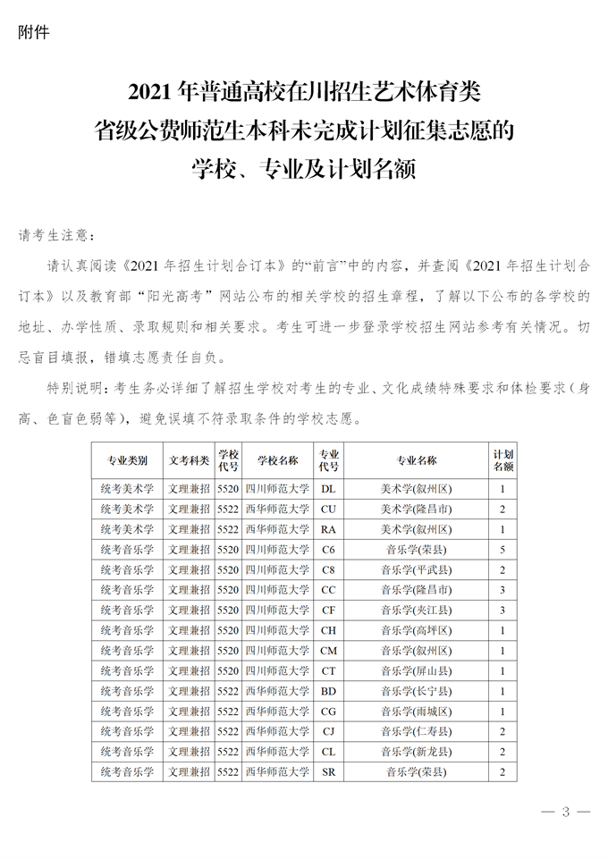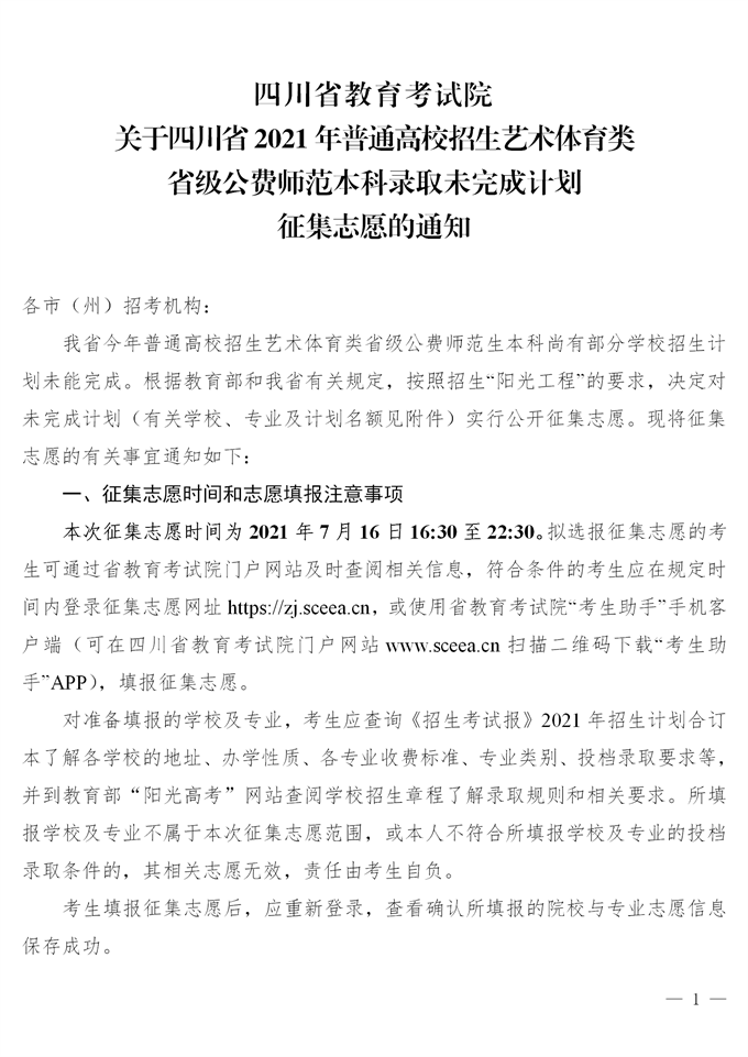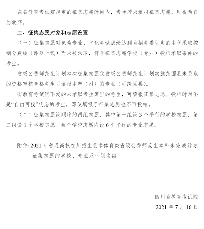 关于四川省2021年普通高校招生艺术体育类省级公费师范本科录取未完成计划征集志愿的通知