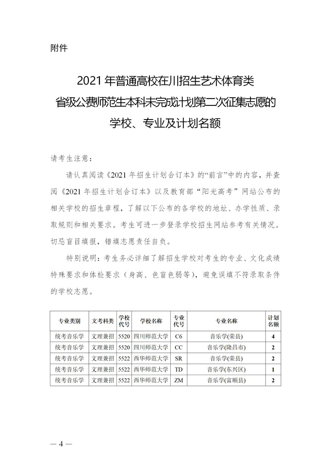 关于四川省2021年普通高校招生艺术体育类省级公费师范本科录取未完成计划第二次征集志愿的通知