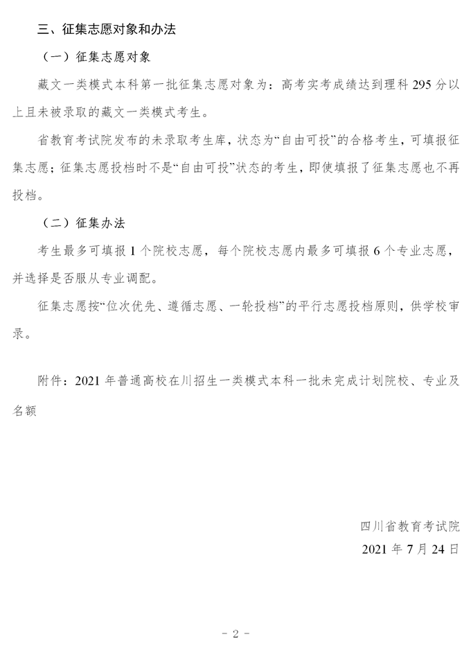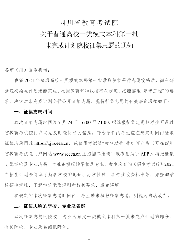 关于普通高校一类模式本科第一批未完成计划院校征集志愿的通知