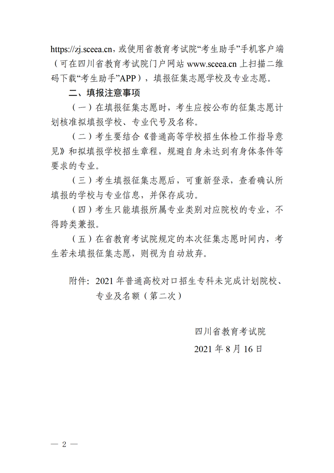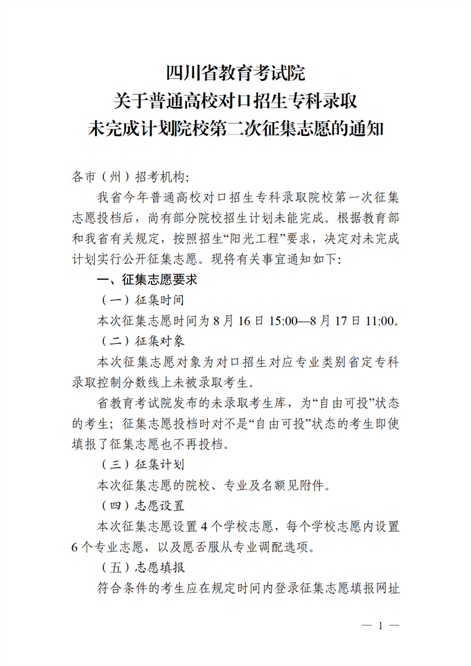 关于普通高校对口招生专科录取未完成计划院校第二次征集志愿的通知