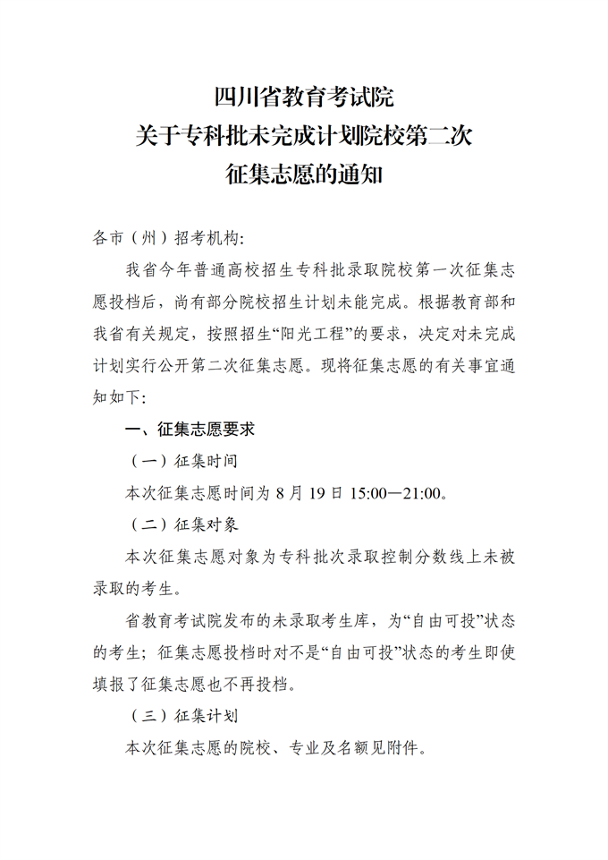 关于专科批未完成计划院校第二次征集志愿的通知(文科)