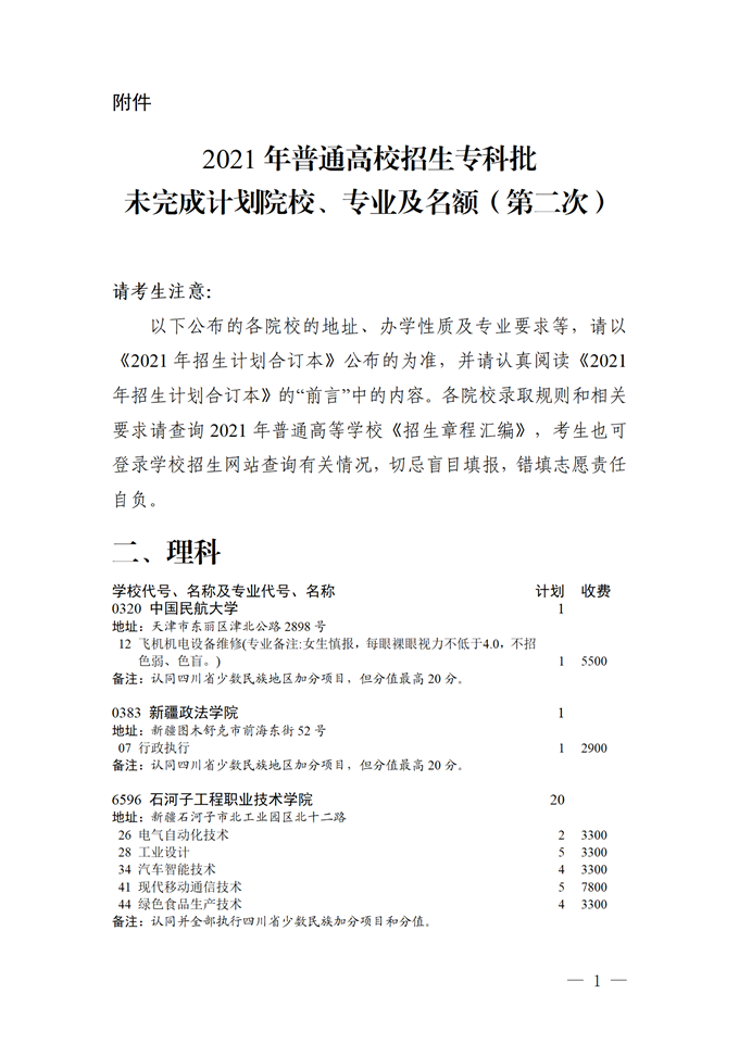 关于专科批未完成计划院校第二次征集志愿的通知(理科)
