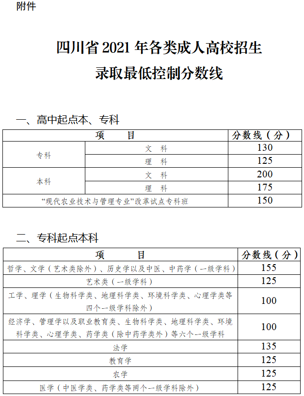 《四川省2021年各类成人高校招生录取最低控制分数线》见附件。