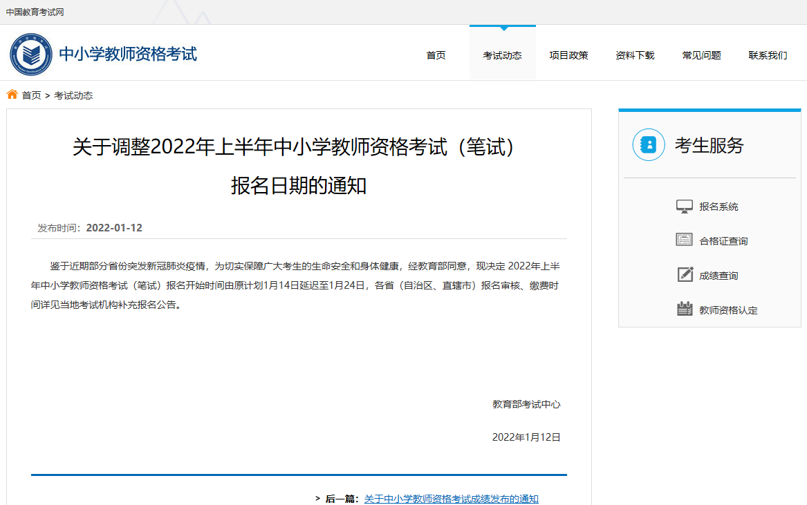 关于调整我省2022年上半年中小学教师资格考试(笔试)报名日期的通知