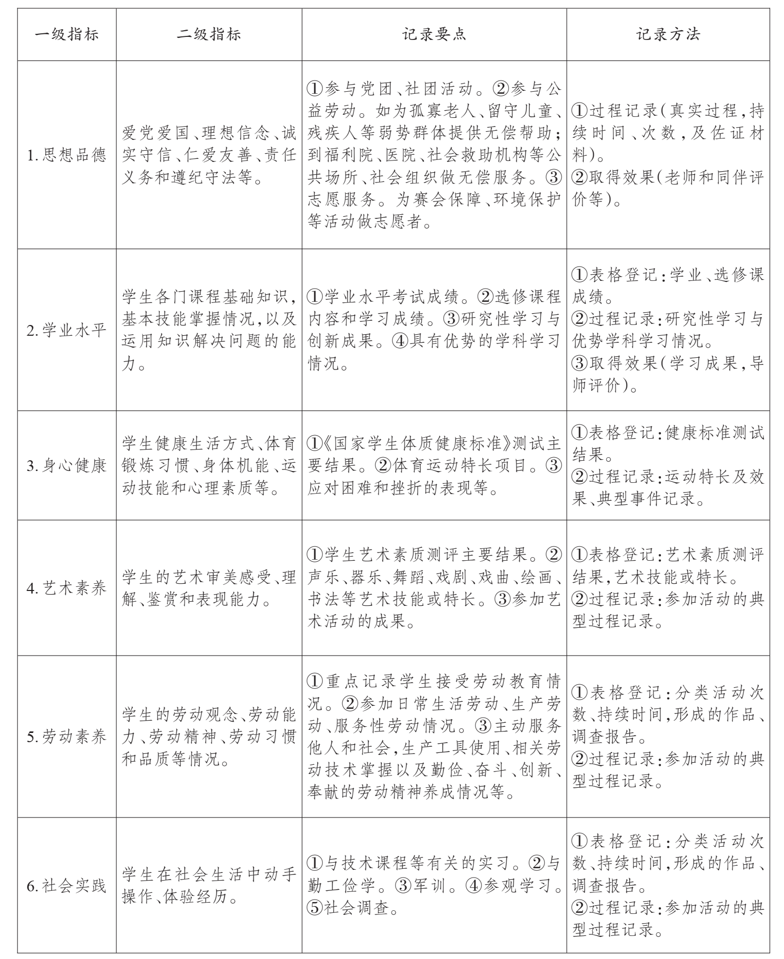 依据党的教育方针,反映学生全面发展情况和个性特长,注重考察学生社会责任感、创新精神和实践能力。主要包括思想品德、学业水平、身心健康、艺术素养、劳动素养、社会实践等内容。