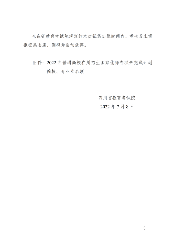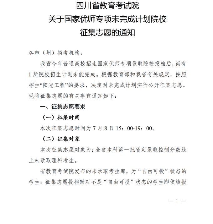 关于国家优师专项未完成计划院校征集志愿的通知