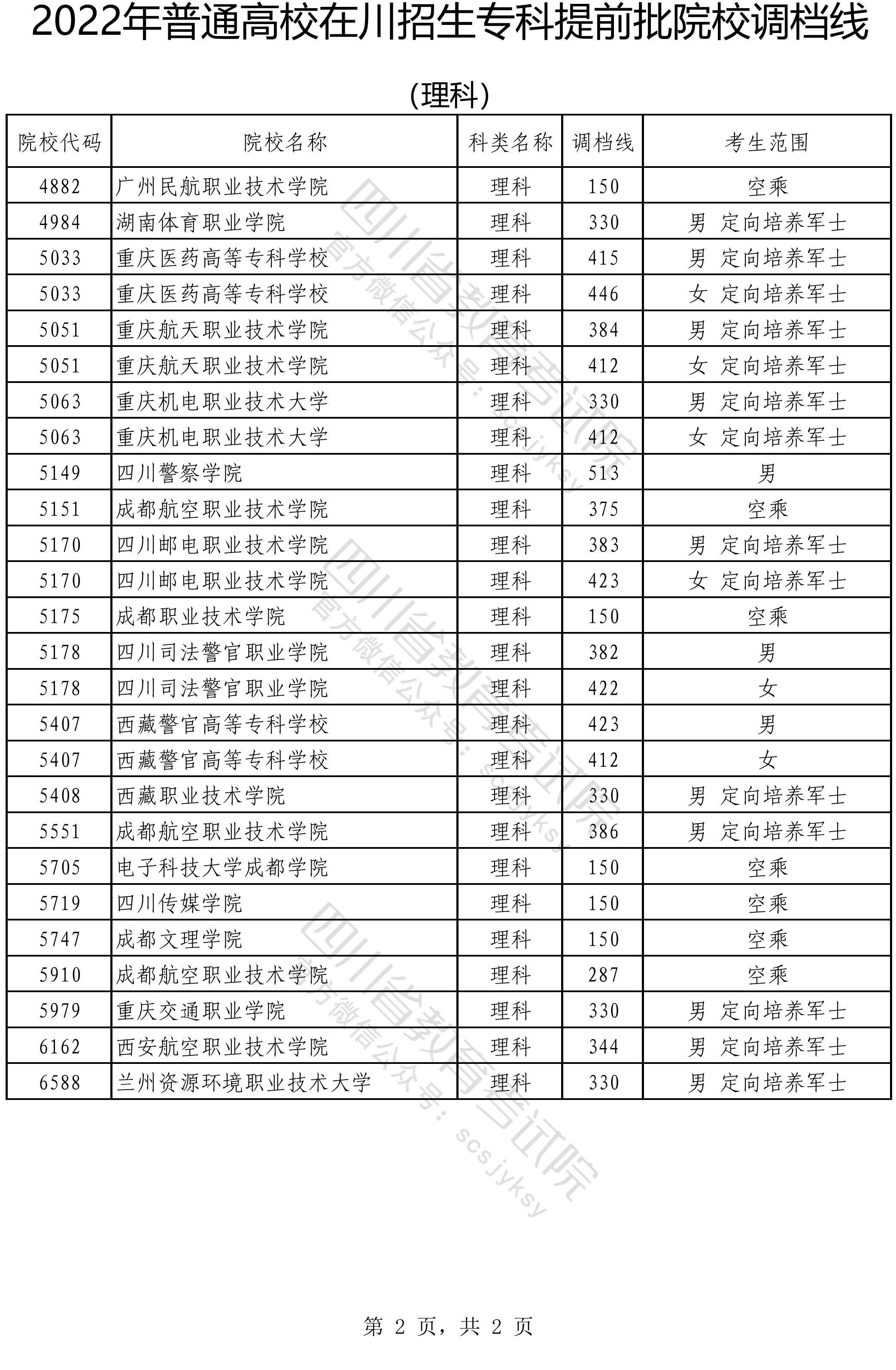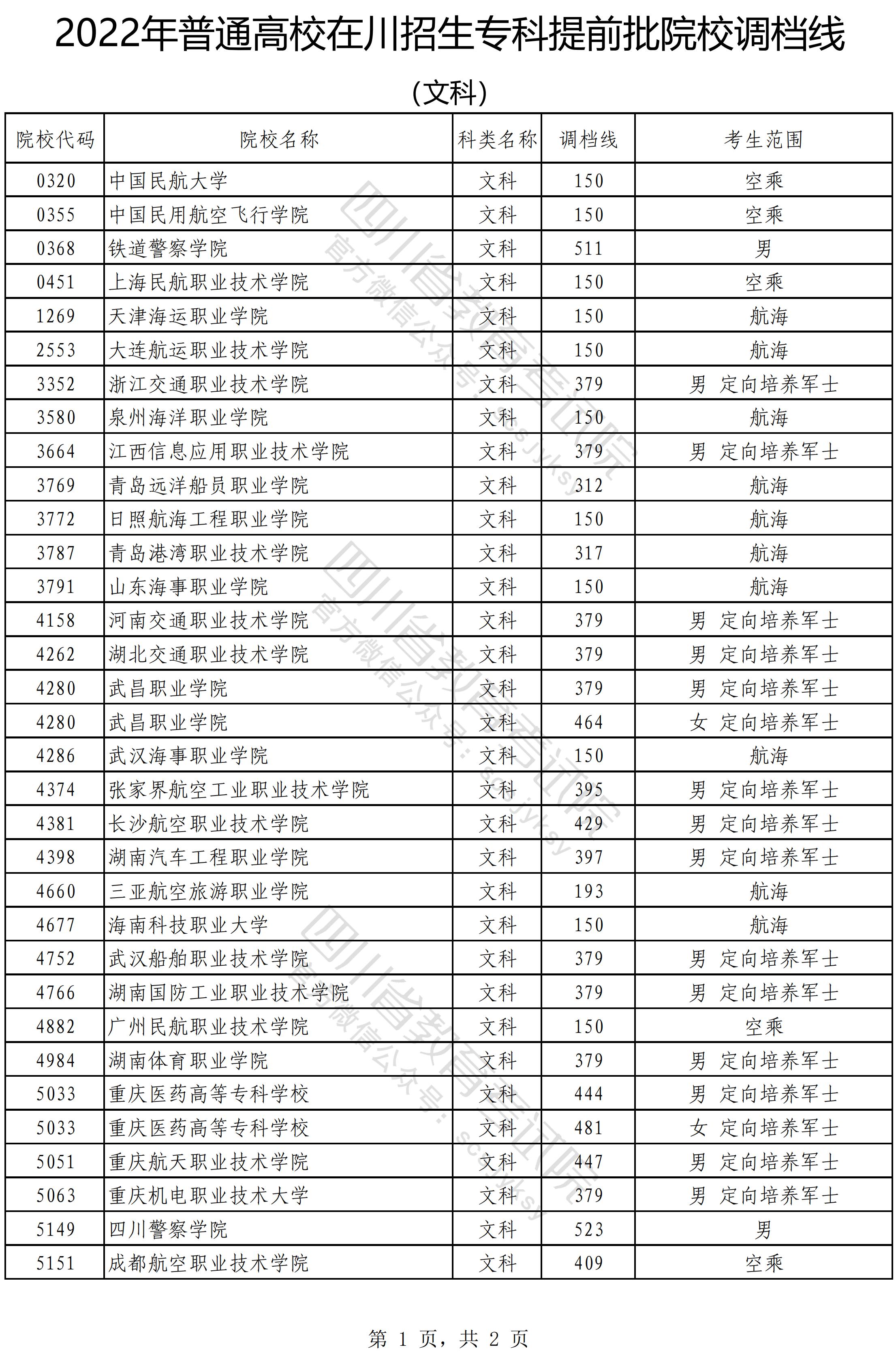 2022年普通高校在川招生专科提前批院校调档线