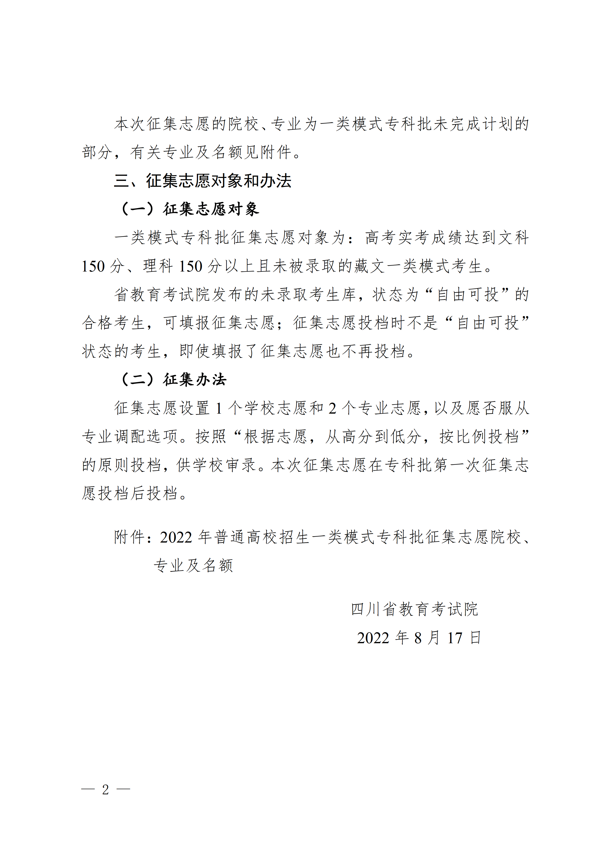 关于普通高校一类模式专科批未完成计划院校征集志愿的通知