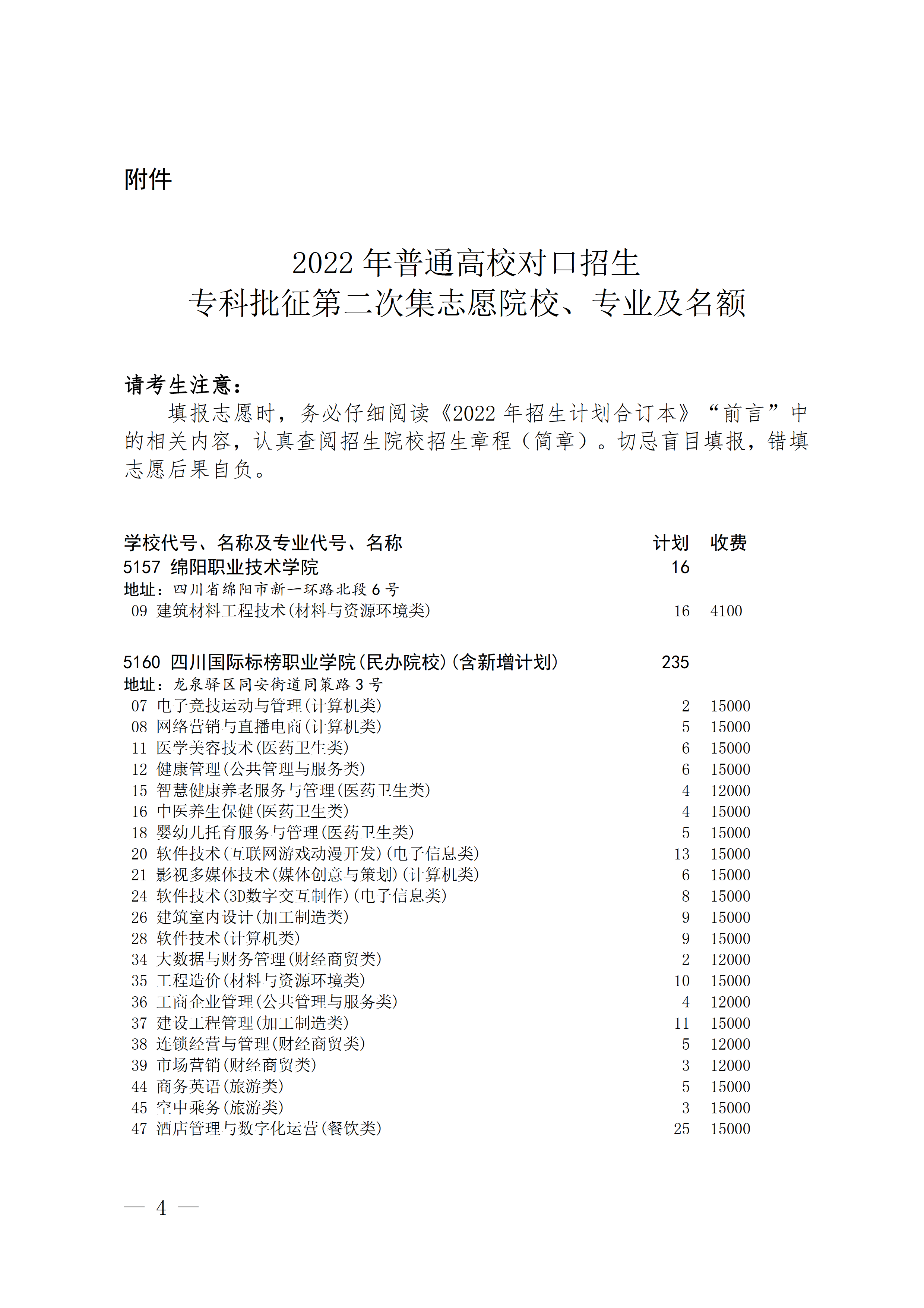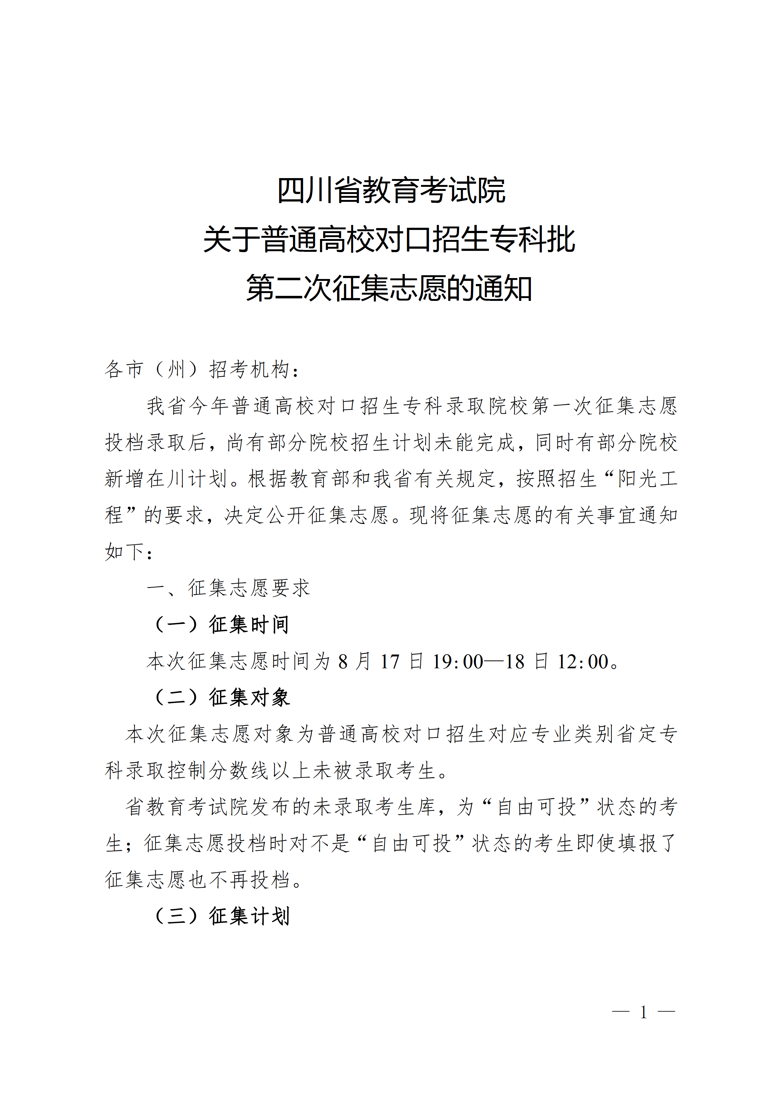 关于普通高校对口招生专科批第二次征集志愿的通知