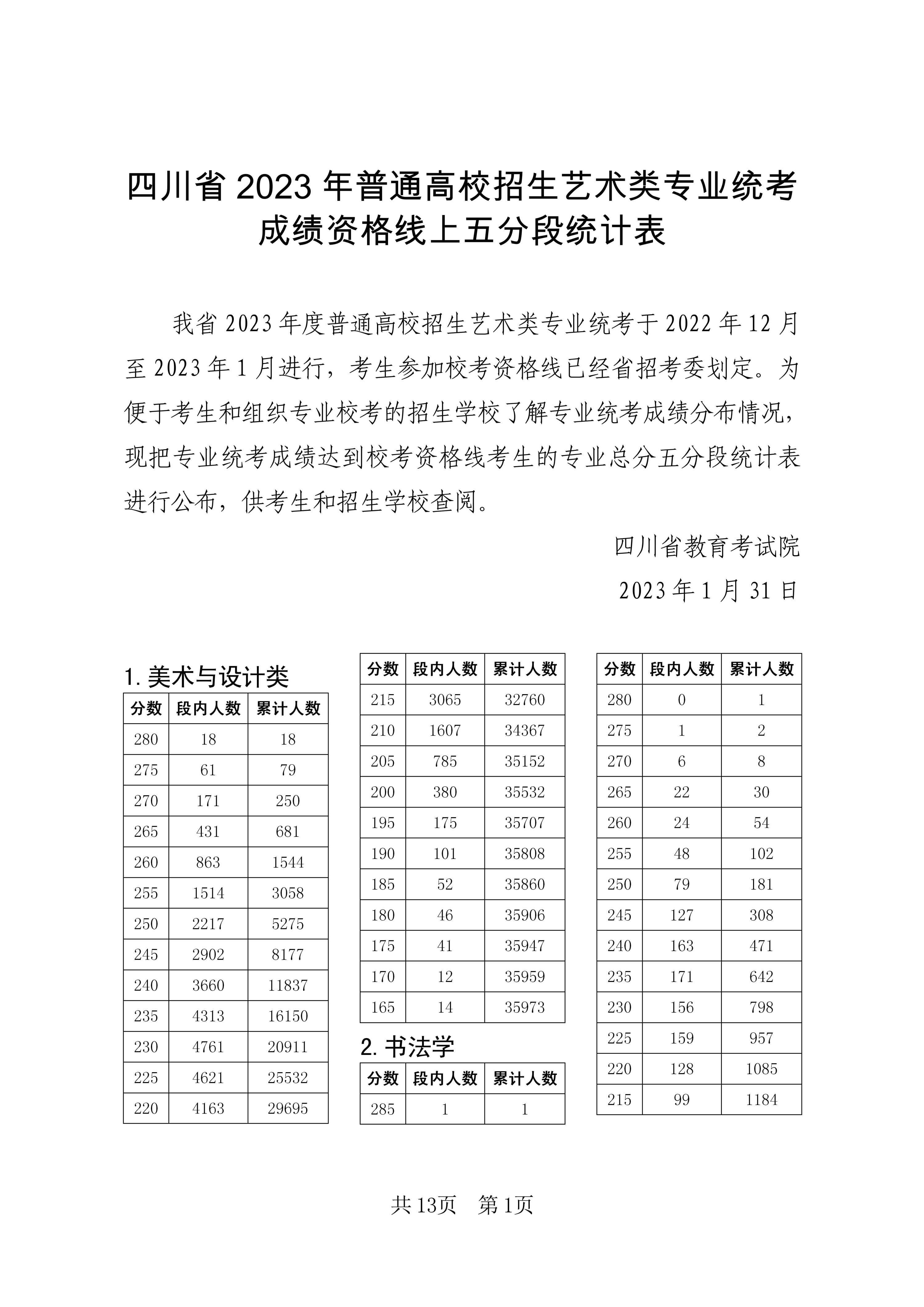 四川省2023年普通高校招生艺术类专业统考成绩资格线上五分段统计表