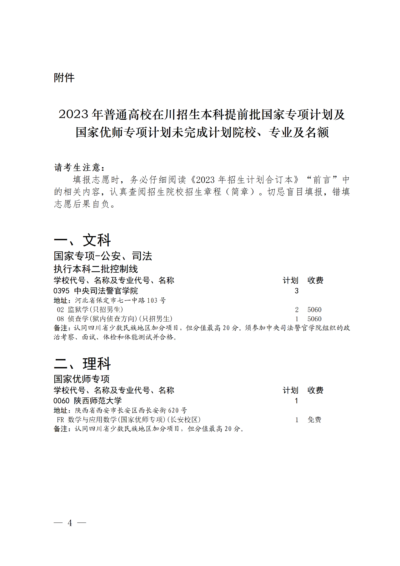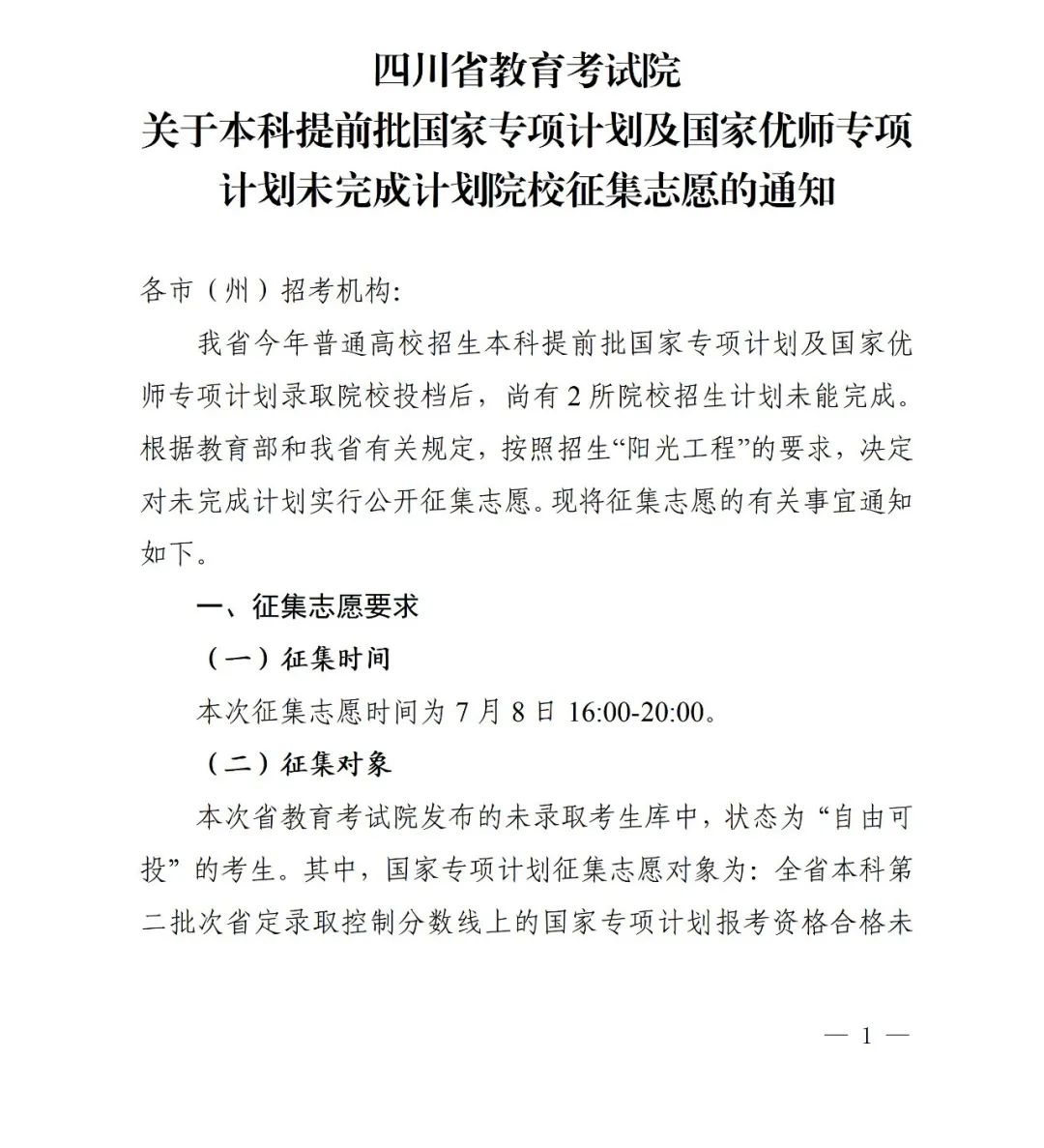 关于本科提前批国家专项计划及国家优师专项计划未完成计划院校征集志愿的通知