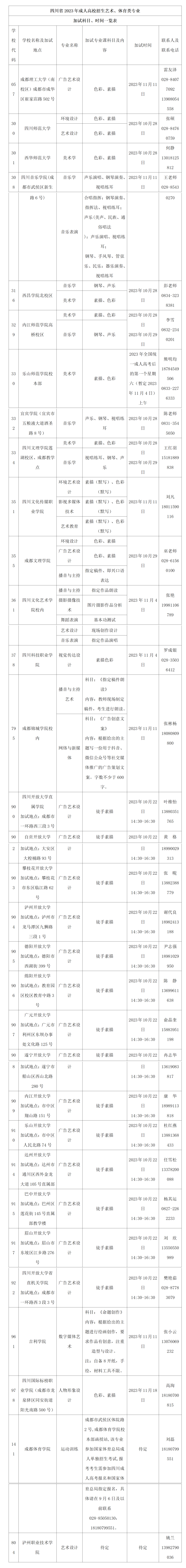七、高中起点和专升本艺术、体育类专业术科加试的时间、地点,请考生参看快乐彩18新利网站以及各市州招办网站公布的《四川省2023年成人高校艺术、体育类专业加试科目一览表》,个别未公布术科加试时间、地点的高校及专业,请考生及时与所报高校联系。