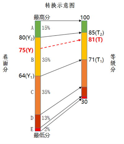 例如,假设某同学化学学科卷面分为75分,按照卷面分排序,等级比例应划分到B等级,而该学科B等级的卷面分分布区间为80~64,等级分区间为85~71,按照转换公式:
