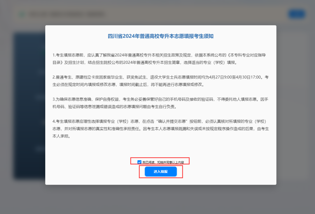 请考生仔细阅读须知内容,在弹窗最下方勾选“我已阅读、知晓并同意以上内容”后,再点击“进入填报”按钮进入填报主页。