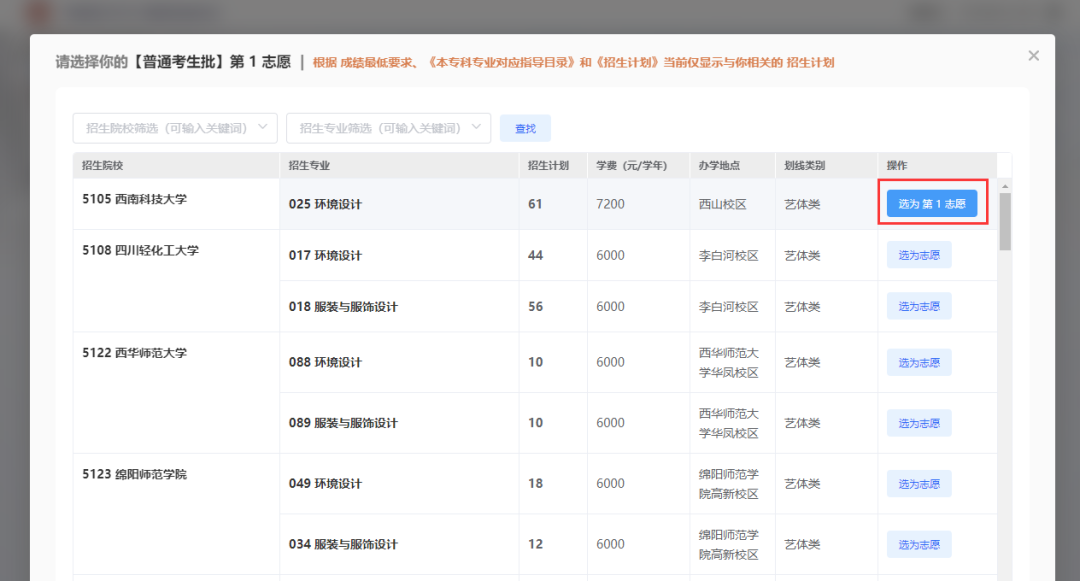 考生点击“选为第1志愿”按钮,即可将该招生专业(学校)选为您的第1志愿。