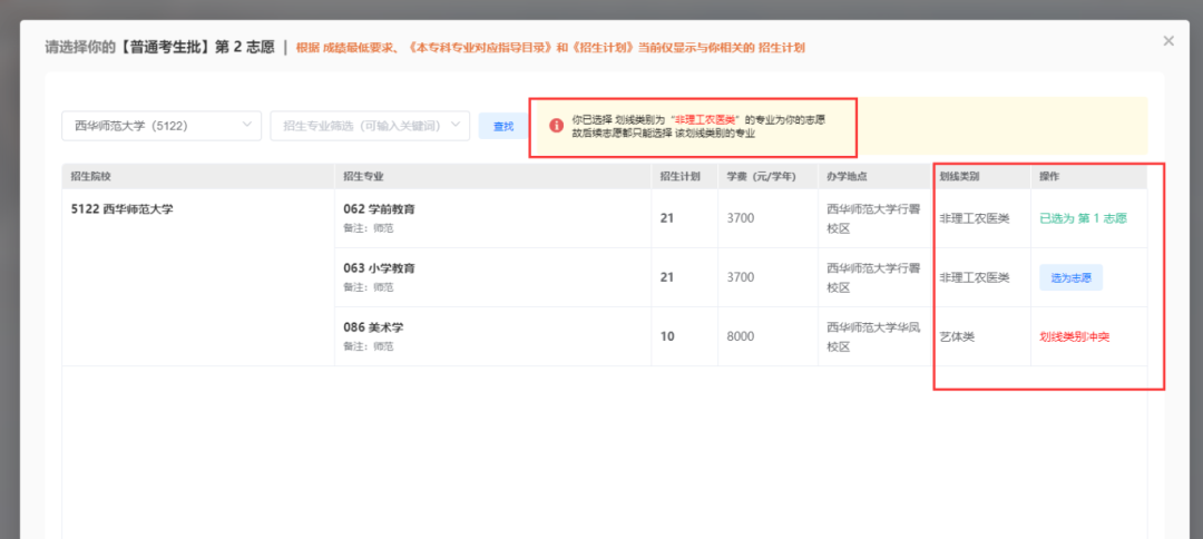 在本人所属批次志愿表中,需按顺位依次填写志愿。以普通考生填报第1志愿为例,页面如下图所示: