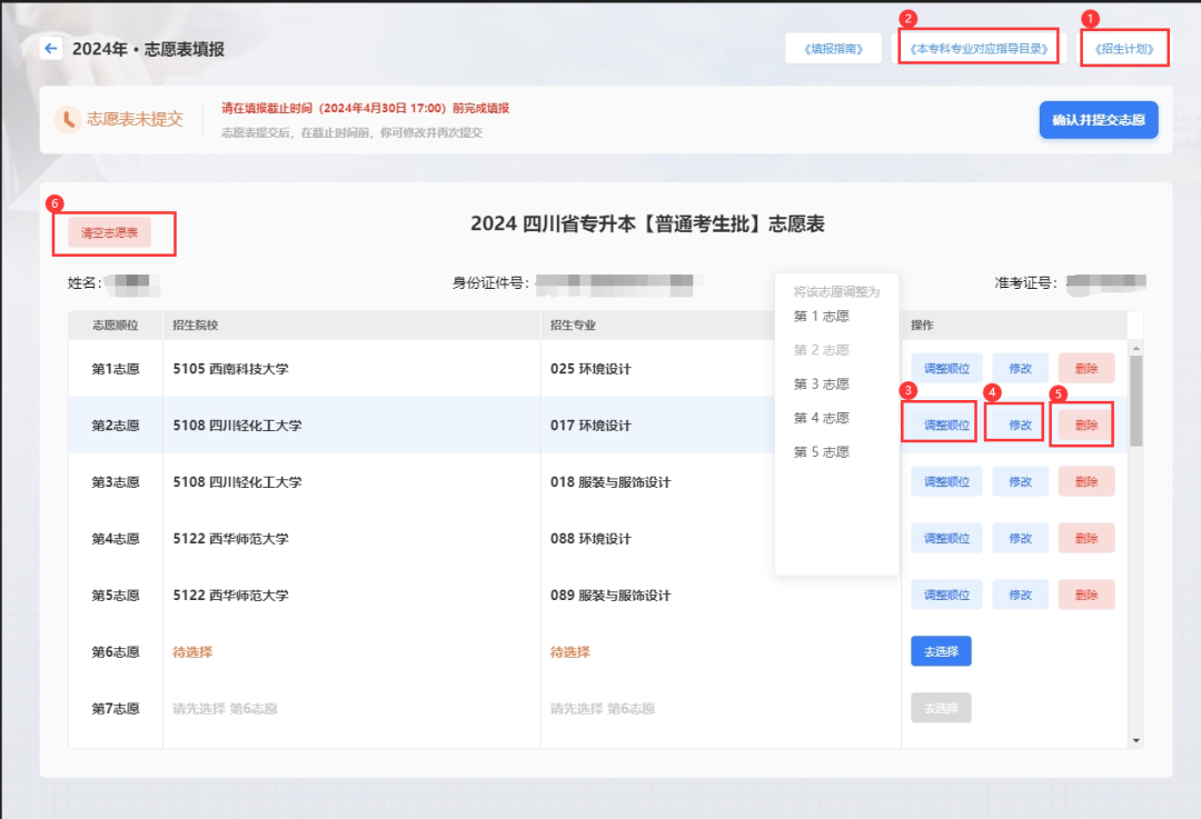 若您想查询今年的普通高校专升本招生计划,可点击志愿表上方的“招生计划”(红框1)查看;若您想查看本人就读专业对应的本科专业,则可点击志愿表上方的“本专科专业对应指导目录”(红框2)查看。若您想调整所选志愿次序,可点击对应志愿的“调整顺位”(红框3)按钮;若您想修改所选志愿,可点击对应志愿的“修改”(红框4)按钮;若您想删除所选志愿,可点击对应志愿的“删除”(红框5)按钮;若您想删除所有志愿,可点击志愿表左上方的“清空志愿表”(红框6)按钮;各红框位置如下图所示: