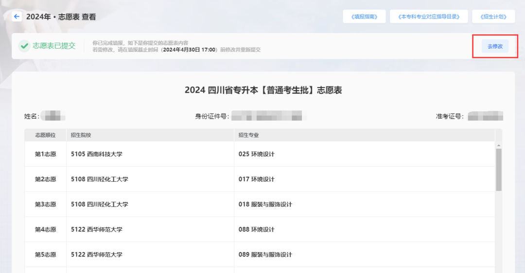 考生在规定时间内(4月27日9:00至4月30日17:00),可多次修改已提交的志愿(获奖免试生除外)。如需修改志愿,可在志愿表查看页点击“去修改”按钮,进入志愿表填报页面修改志愿。如下图所示: