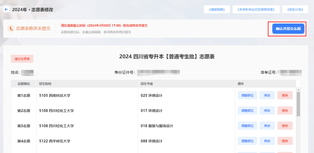 修改志愿与填报志愿时的操作一致,修改完成后点击“确认并提交志愿”按钮即可完成该批次志愿修改。如下图所示: