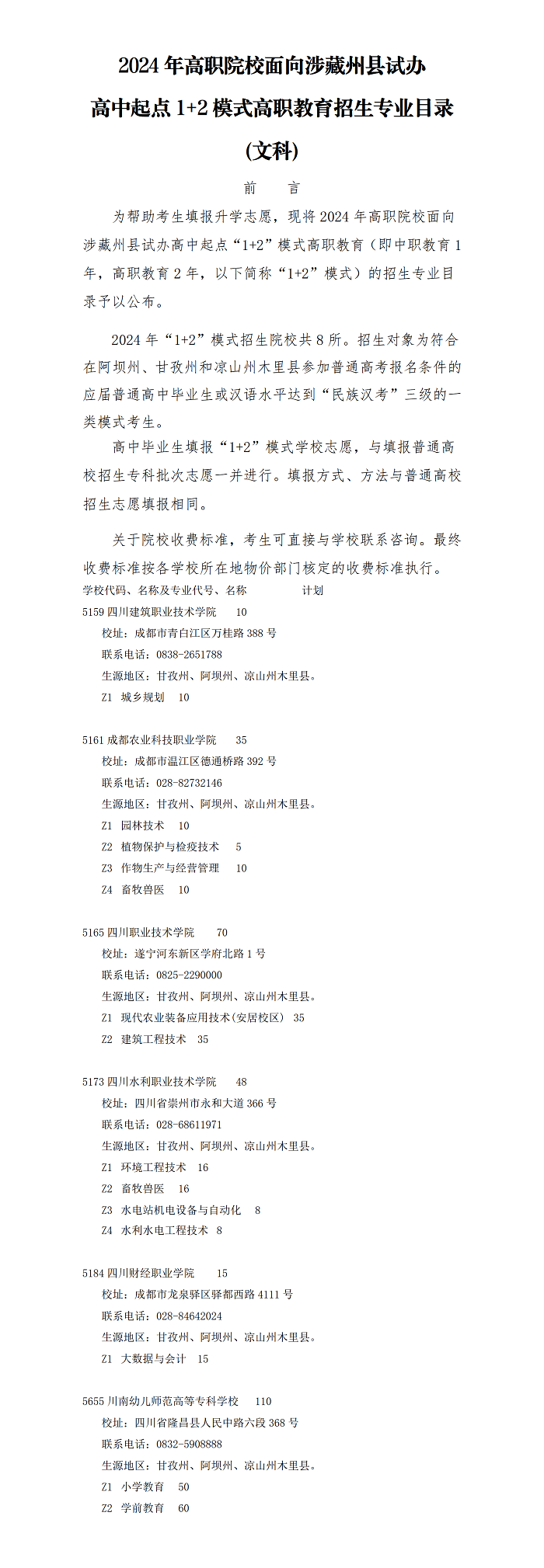 2024年高职院校面向涉藏州县试办高中起点1+2模式高职教育招生专业目录