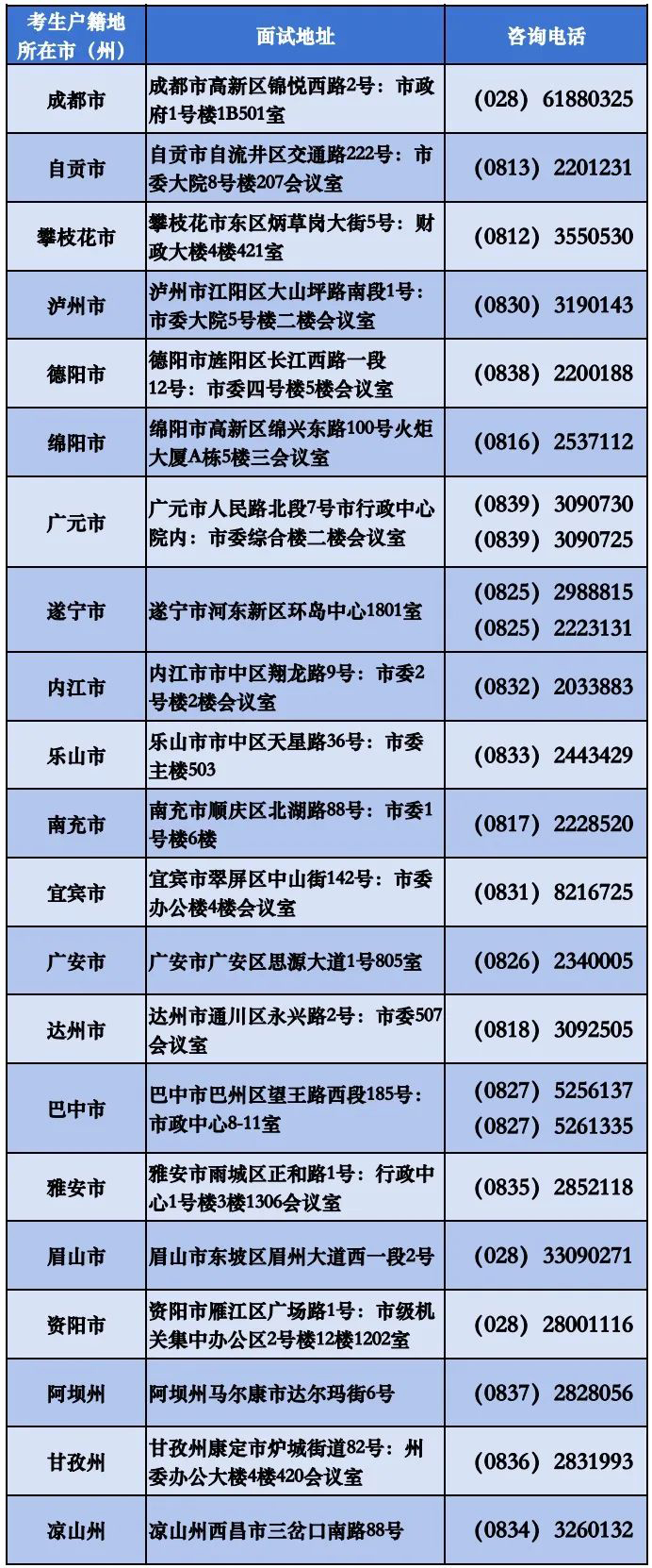 6月28日至29日,进入面试考生参加户籍所在地的市(州)面试工作小组组织的面试,具体时间以有关市(州)通知为准(通过短信或者电话方式告知)。各市(州)面试地点和咨询电话详见附件。