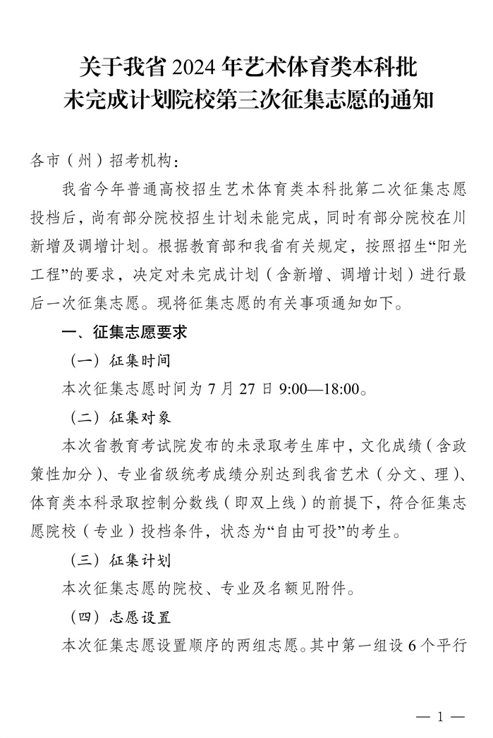 关于我省2024年艺术体育类本科批未完成计划院校第三次征集志愿的通知