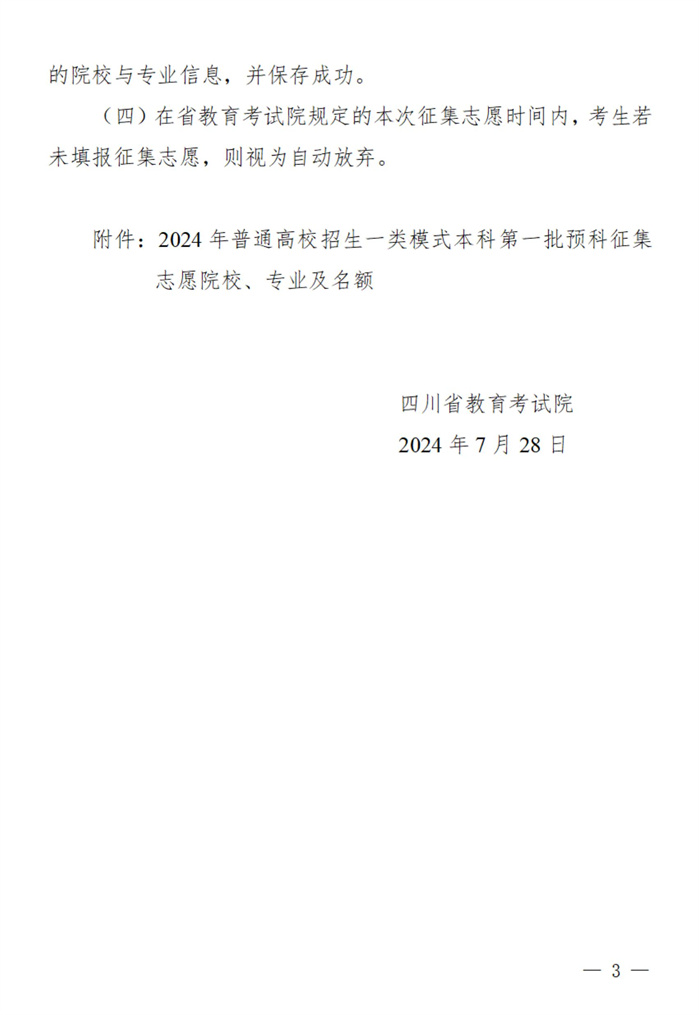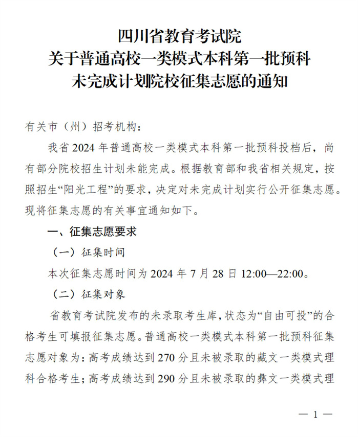 关于普通高校一类模式本科第一批预科未完成计划院校征集志愿的通知