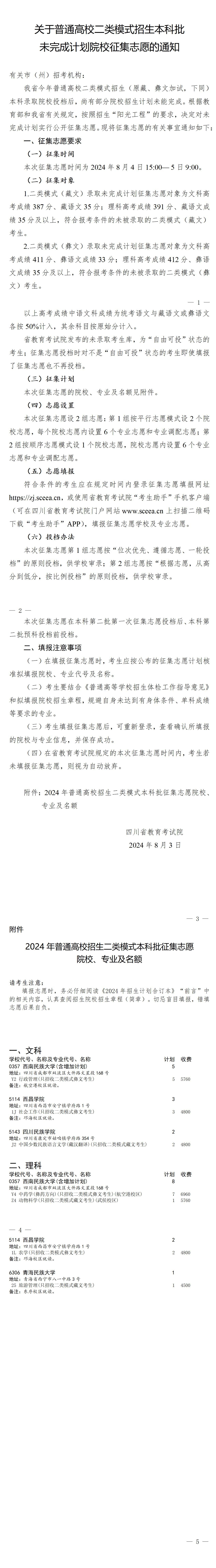关于普通高校二类模式招生本科批未完成计划院校征集志愿的通知