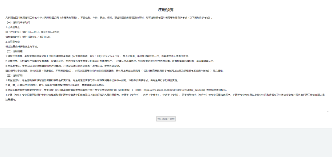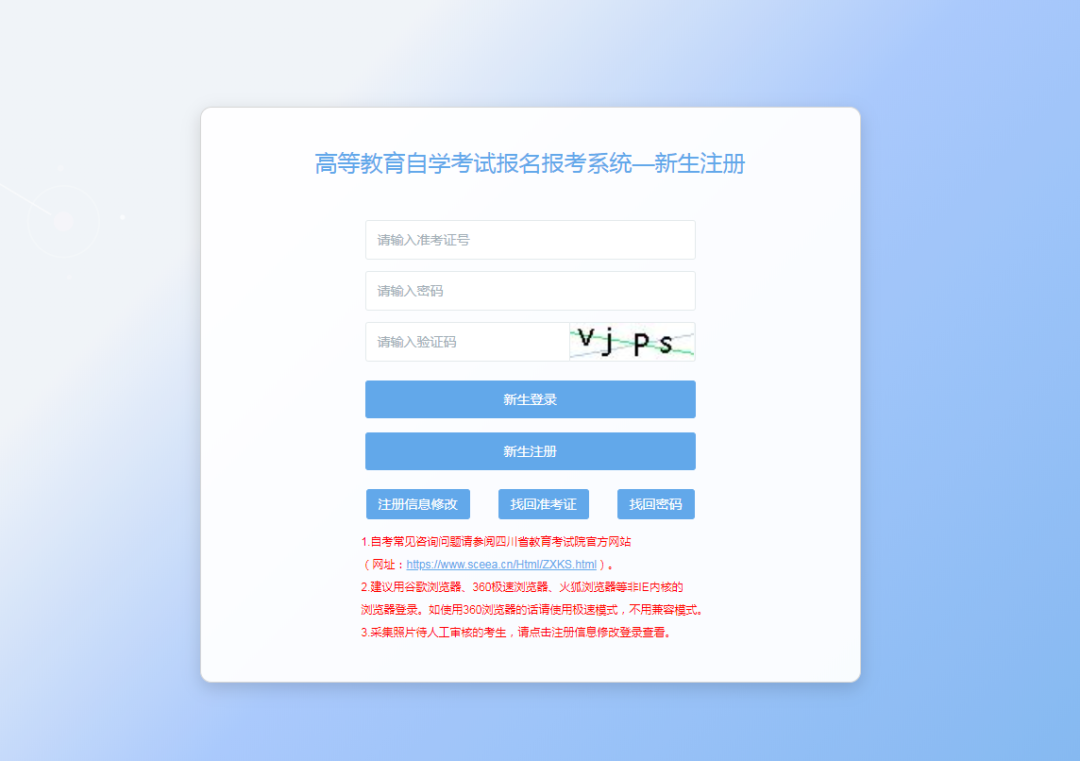 自学考试网上新生注册及课程报考系统(以下简称系统,网址:https://zk.sceea.cn/)。